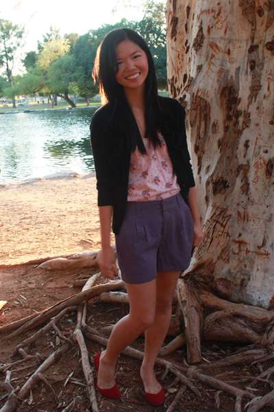 f21 cardigan + top + shorts; steve madden flats