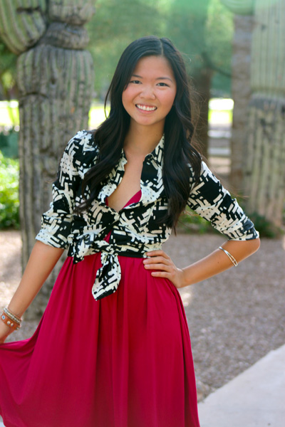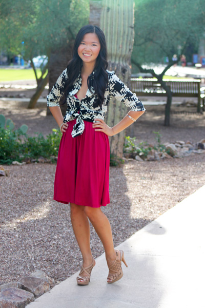 I’m left in a limbo of stylistic sorts. It’s too hot to fully embrace fall fashion, but it’s too late in the year to be prancing around in a tank top and cut-off denim. So after playing around in my closet last week, I accidentally concocted what might be the perfect solution. I combined a lightweight frock (you can’t see it, but the cut of the upper half totally reads summer sundress) with a boldly patterned button-up shirt (last seen here). Finally, the best of both worlds!