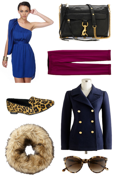 Personally, my list includes: a dress for holiday parties, a black clutch with gold hardware, cranberry-colored pants, a navy peacoat, leopard loafers, a faux-fur neck warmer, and cateye sunglasses.  I don’t plan on getting it all, but I do plan on sticking to my list!