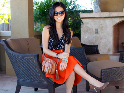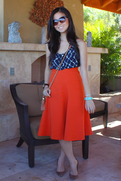 I snagged this orange A-line skirt on sale at H&M recently. I usually wear pencil skirts, but the flare and color on this little guy was too fun to pass up. Topped off with a pair of cat eye sunglasses and I’m feeling all kinds of retro.