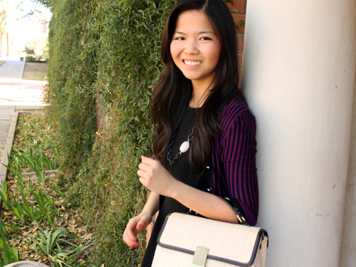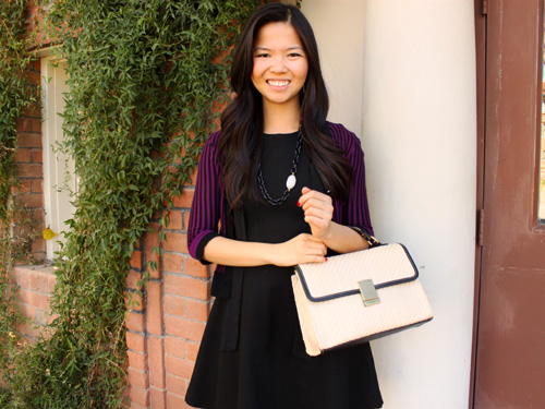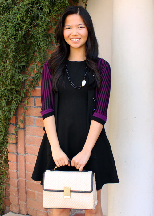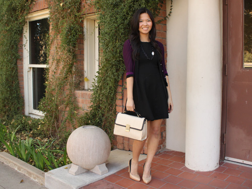 On Monday, I was feeling feminine and today’s look is as equally inspired. I bought this LBD in Chicago knowing that I could get plenty of wear out of it. The conservative neckline is perfect for work, but the a-line cut gives it a little fun flare. Nude pumps and a structured satchel look prim and proper, while a chunky chained necklace (my latest obsession!) and striped cardigan keeps everything youthful.