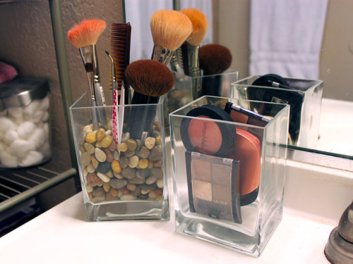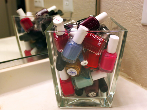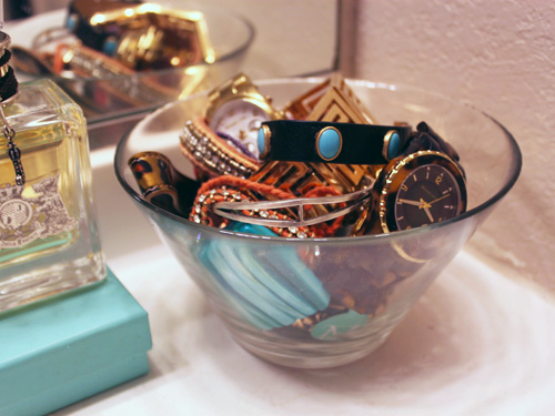 I picked up all the glassware from Ikea — small vases and bowls that I could fill up with frequently used necessities like makeup brushes, nail polishes, and jewelry. It definitely makes it easier to grab what I need, while adding a little visual fun to my daily routine.
