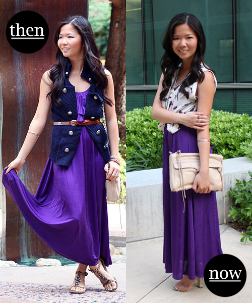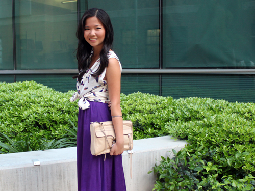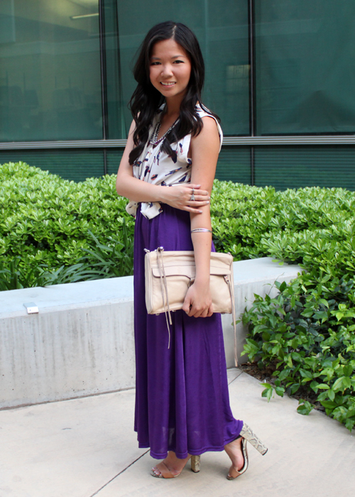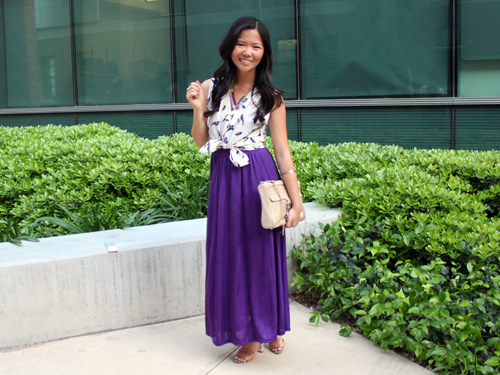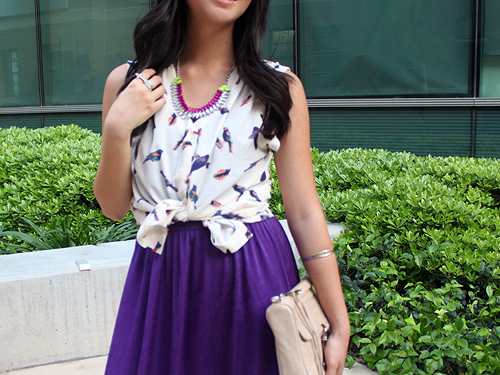 The purple maxi dress is back — this time with a spring twist.  My H&M bird print blouse added the perfect spring touch to this classic maxi.  I’ve been really keen on tying blouses over dresses and skirts since it really jazzes up an otherwise one note piece.  After all, there’s nothing more satisfying than breathing new life into old clothes.