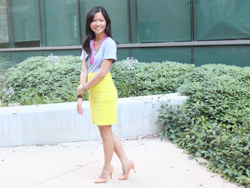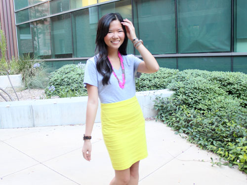 Today, I’m dressing up a regular ol’ t-shirt or dressing down a bright, neon skirt. However you prefer to look at it, I’m digging the mix and match of casual and chic.