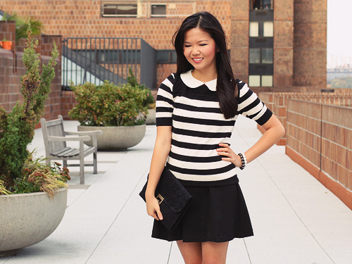 For our first post, we wanted to get into the Halloween spirit without being so literal. Black and white seemed like the perfect balance between festive and chic, so I threw on a black and white striped sweater with a collar that channels a bit of Wednesday Addams. See how Kristin, Christina, and Kacie wore black and white and let us know what you think of the first round of our series!