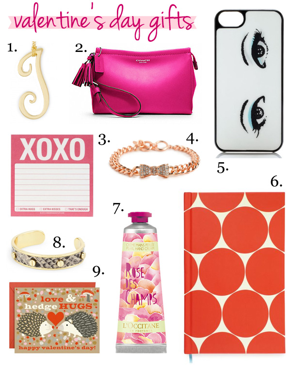 Jenny in Jacquard; NYC fashion blogger; style blog; Valentine's Day 2013  gift guide; shopping roundup; C. Wonder Initial Necklace; Coach Legacy Leather Large Wristlet in silver/fuschia; BaubleBar rose gold bow link bracelet; Kate Spade Lenticular iPhone 5 case; Kate Spade Deborah dot journal; L'Occitane Rose des Champs Perlized Hand Cream; C. Wonder Screw Stud Snake Embossed Skinny Cuff; Paper Source XOXO Sticky Notes; Paper Source Hedgehogs A2 Valentine Cards