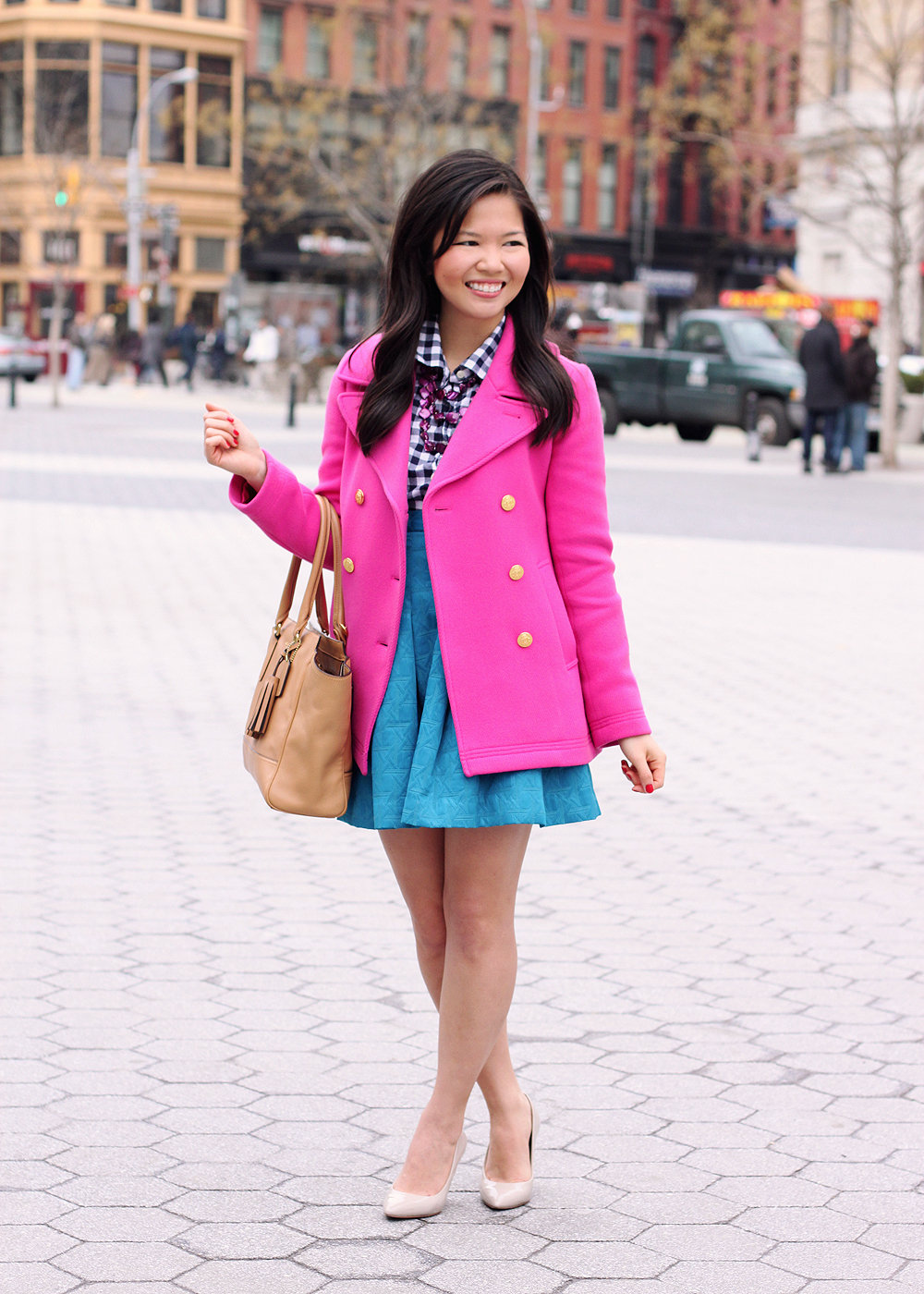 Skirt The Rules; NYC fashion blogger; style blog; how to transition from winter to spring; J.Crew hot pink majesty stadium cloth coat; J.Crew Factory navy gingham button up shirt; Kirna Zabete for Target turquoise jacquard skirt; Coach Candace carryall tote in camel; New York & Co. purple stone necklace; C. Wonder snake skinny cuff; Pour La Victoire Mai wedge