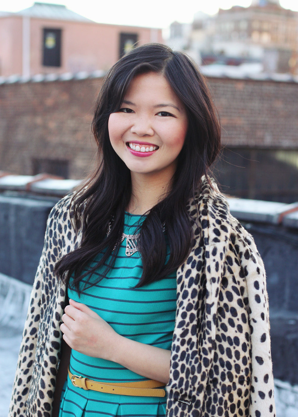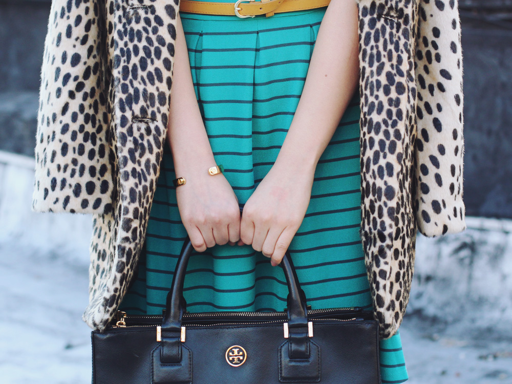 I took a trip an excursion to the Target in Brooklyn a few weeks ago to buy a few household goods, but as always, got completely distracted by things I don’t need (I think that’s Target’s secret objective). I ended up browsing the clothing racks (surprise surprise) and scooped up this simple, striped dressed. I’m in love with the turquoise color and feminine shape. It’s perfect for work, but topped off with a leopard coat and it’s even better for brunch or happy hour with the girls.