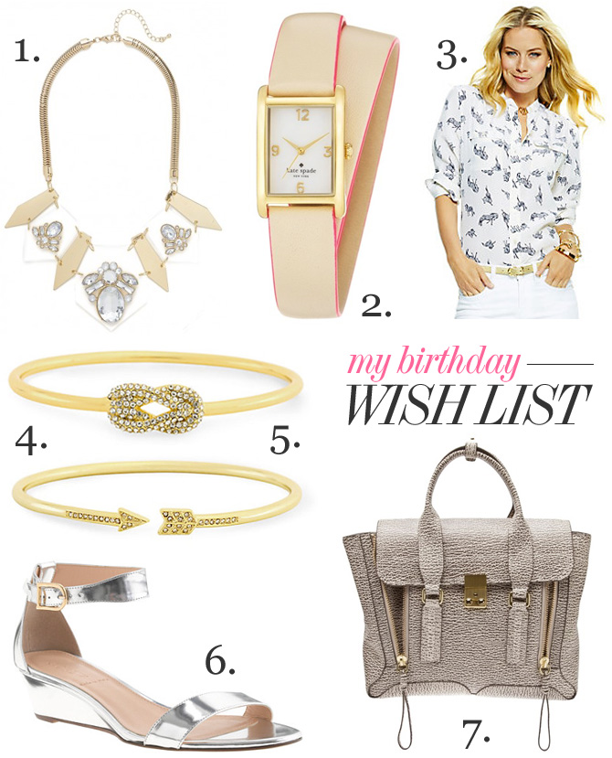 Skirt The Rules Blog; NYC fashion blogger; style blog; 27 year old birthday wish list; BaubleBar Nebula Lucite Bib Necklace; Kate Spade Cooper Wrap Strap Watch; C.Wonder Dancing Zebra Silk Shirt; C. Wonder Arrow Bangle; C. Wonder Love Knot Bangle; J.Crew Lillian Mirror Metallic Wedges; 3.1 Phillip Lim 'Pashli - Medium' Leather Satchel