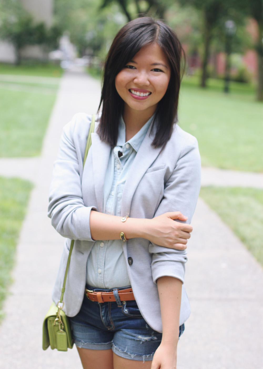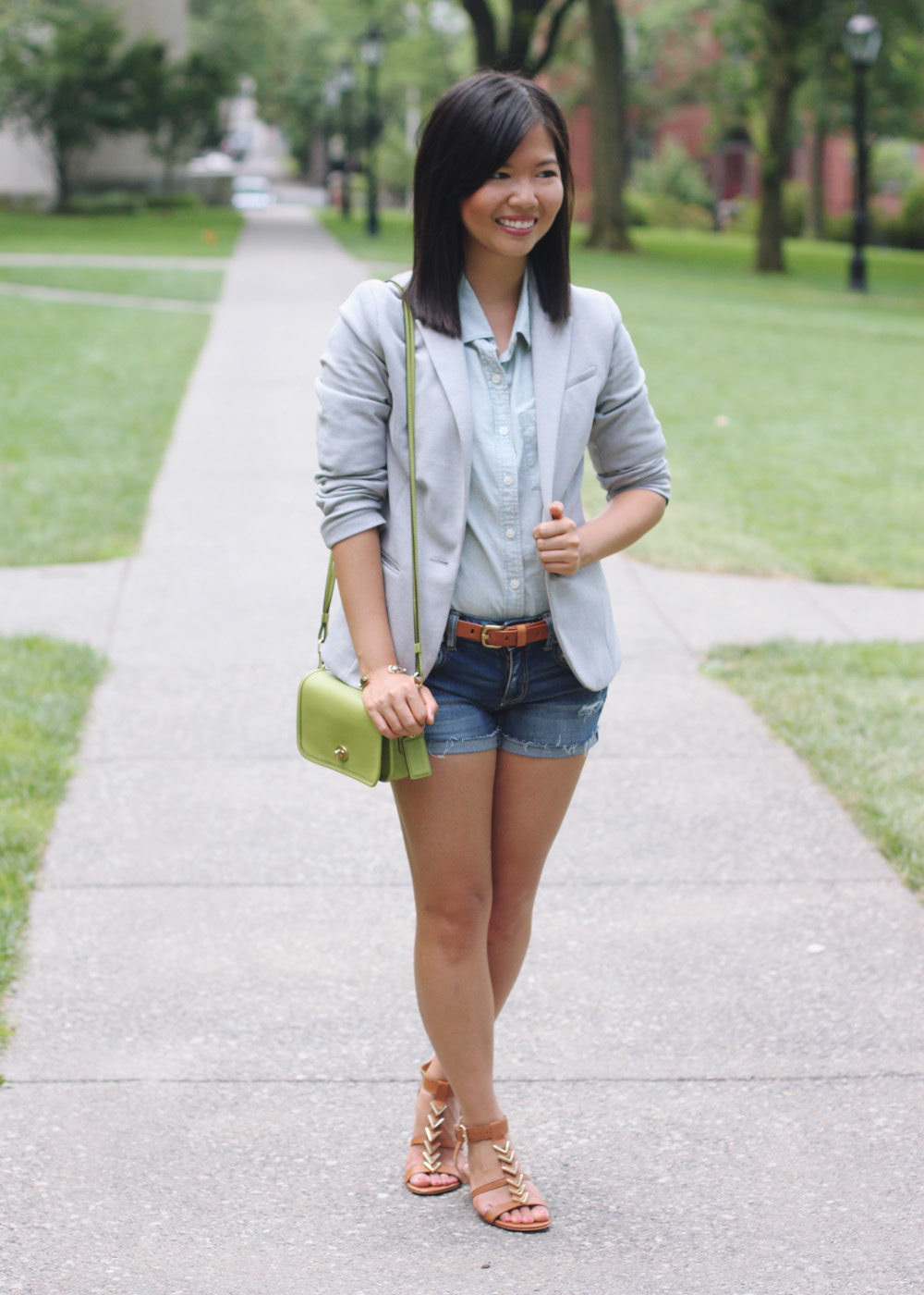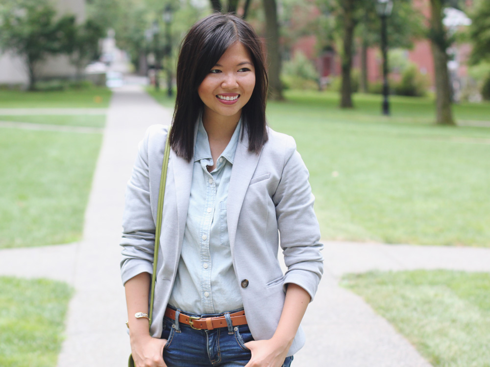 For our stroll through the Brown University campus, I put on my version of the summer suit: a double dose of denim topped with a light gray blazer and cognac accessories. A little bit casual, a little bit collegiate and a whole lot of chic.