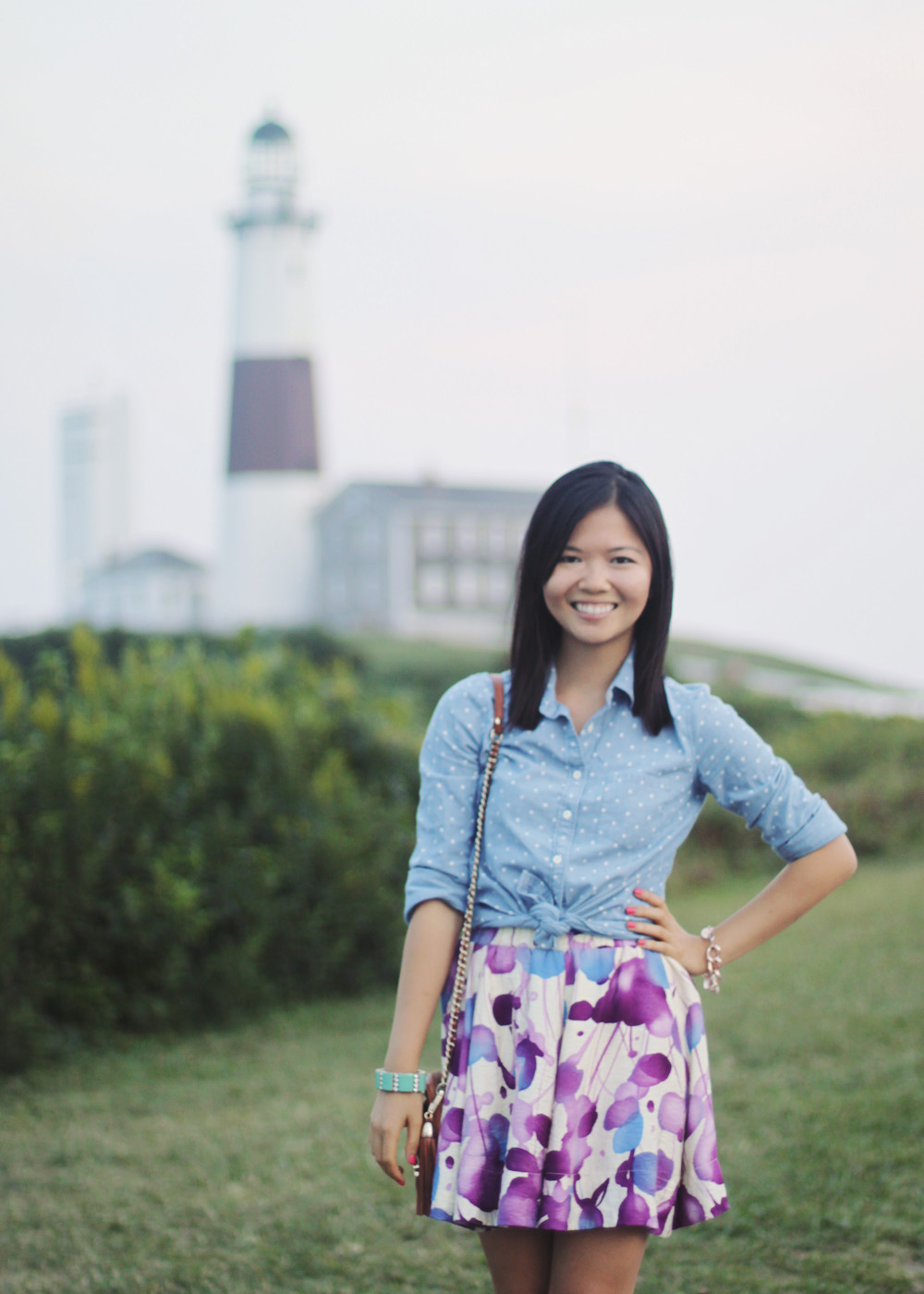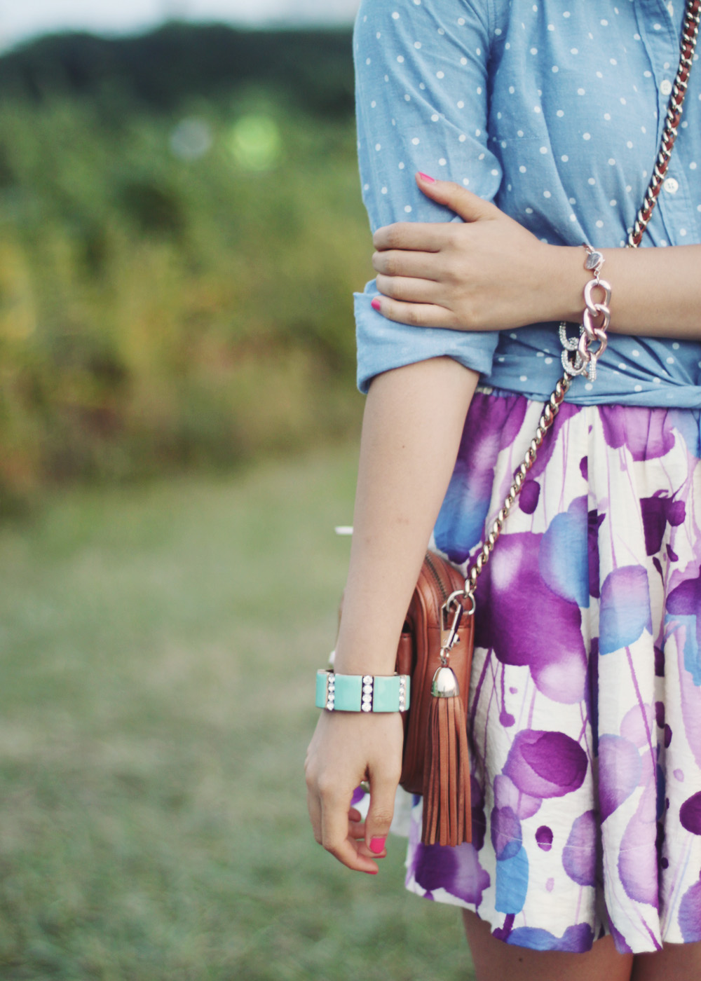 Skirt The Rules Blog; NYC fashion blogger; style blog; summer outfit photos; J.Crew chambray polka dot button up shirt; Forever 21 watercolor floral skirt; J.Crew turquoise stretch bracelet; Derng rosegold pave link bracelet; Rebecca Minkoff BF crossbody bag; Zara nude and white colorblock basic heel