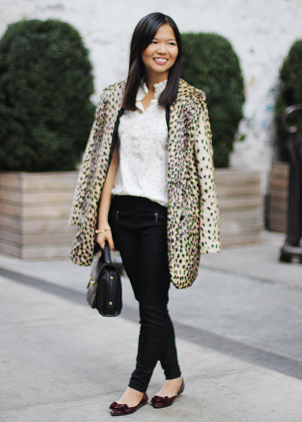 Like I said yesterday, the faux fur is officially out of hibernation and the first order of business: this leopard coat that I scored on major sale last winter. You know I’m no stranger to leopard, but somehow I manage to be simultaneously in love and intimidated with this coat. It’s a little ostentatious, but hey, when in NYC — anything goes.