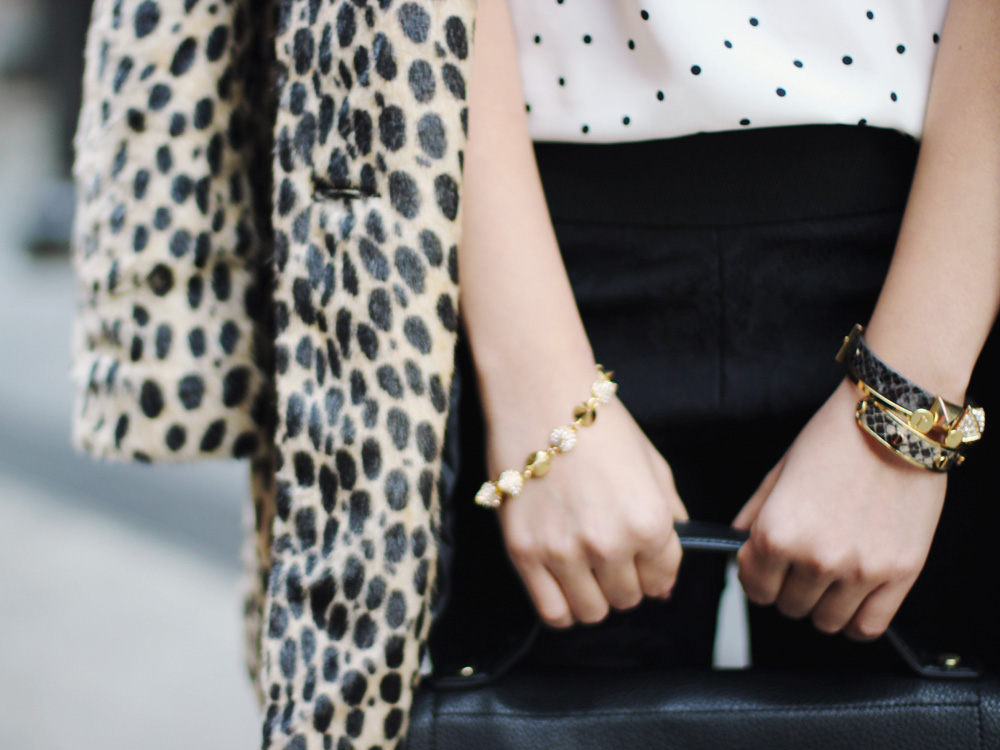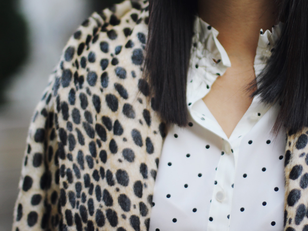 To avoid going from good to gaudy, I kept the rest of my outfit relatively relaxed. A light polka dot blouse adds a subtle mixed print flare, but skinny pants and neutral accessories let the showstopper speak for itself.