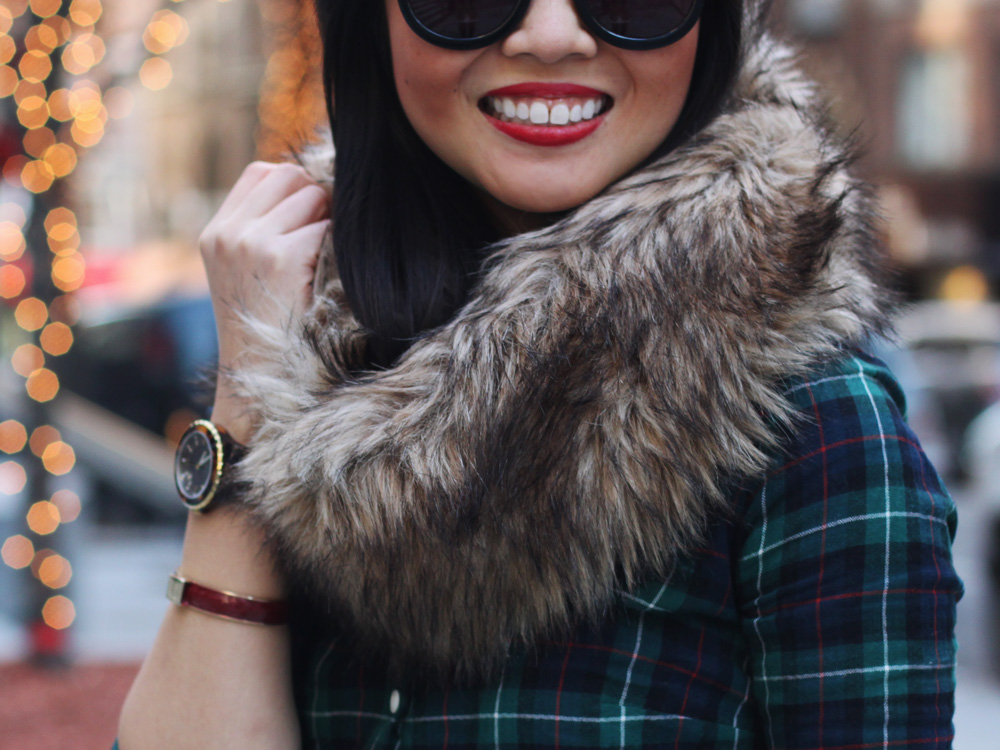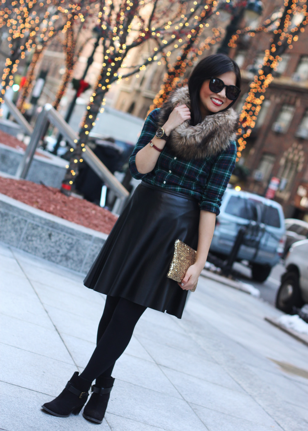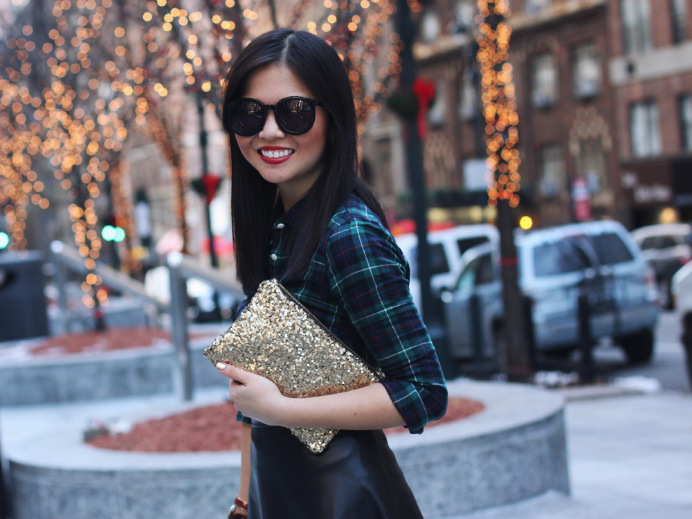 It’s Christmas Eve Eve, so I’m elevating my favorite plaid shirt into the perfect party look. Faux fur, faux leather and gold sequins? Check, check and check!