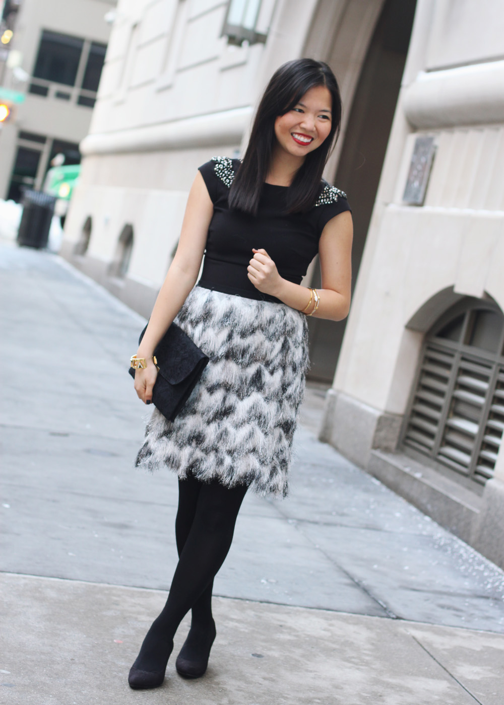 I can’t believe we’re nearly one week into 2014. Last week, I rang in the new year in this little fringe number. It was my last, but perhaps favorite purchase of 2013. I had been looking for an affordable feathered skirt for ages, and while this one isn’t made of actual plumage, the omrebe fringe is like a light replica. It’s now nesting happily in my wardrobe and I can’t wait to hatch up another outfit with it!