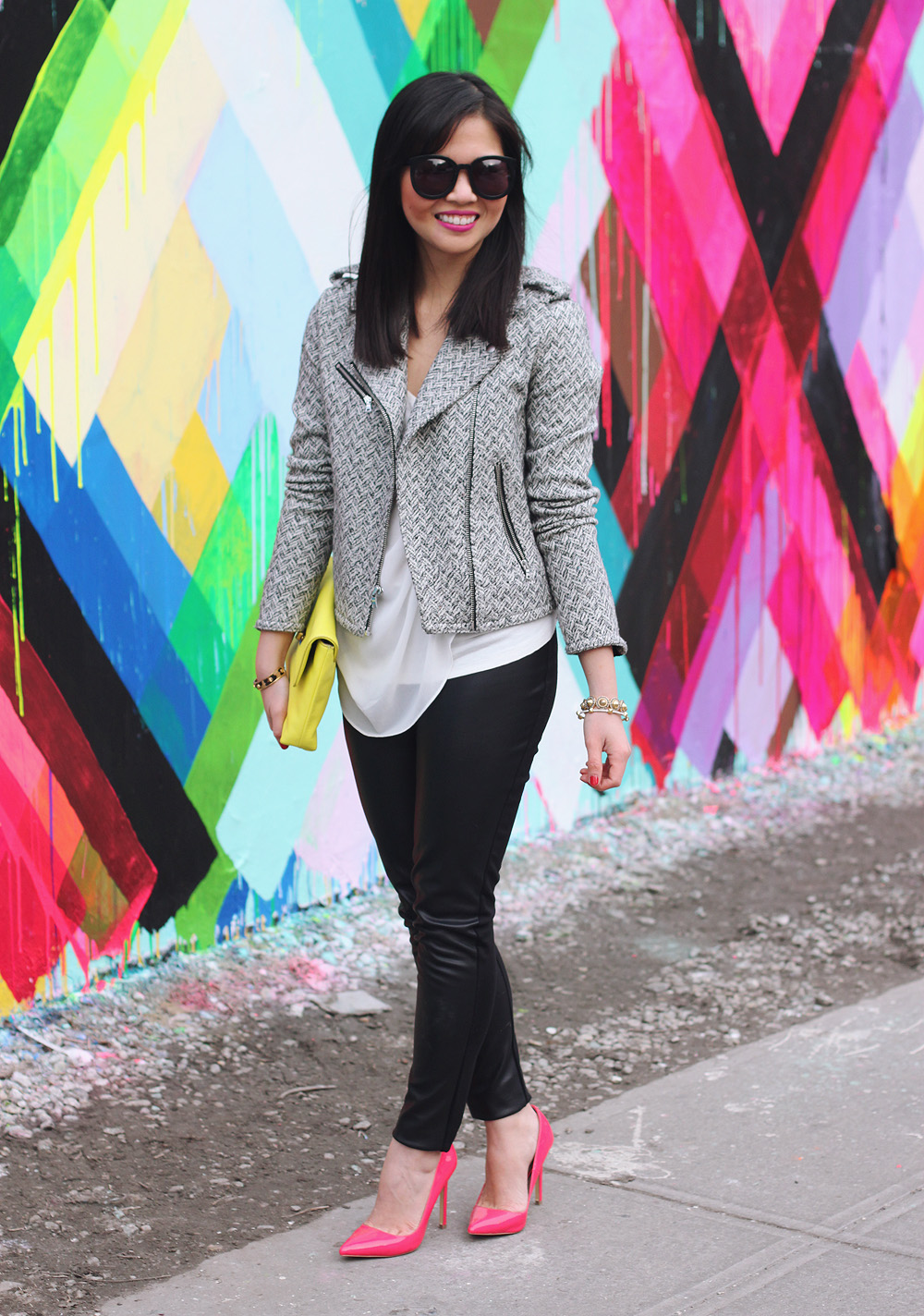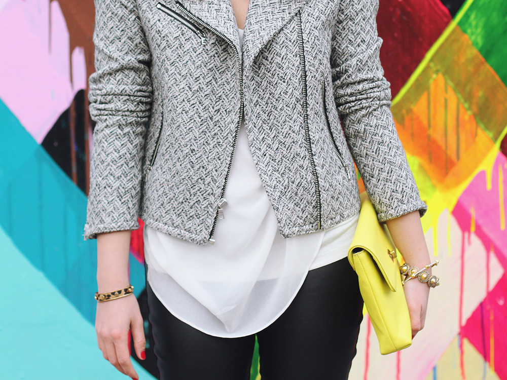This mural is going down in the books as one of my faves. Bright colors and a bold print — it was love at first sight and it was the perfect canvas for my tweed moto jacket, faux leather pants and neon accessories that look like they could’ve came from the mural itself. What can I say? I like my street style to match my street art.