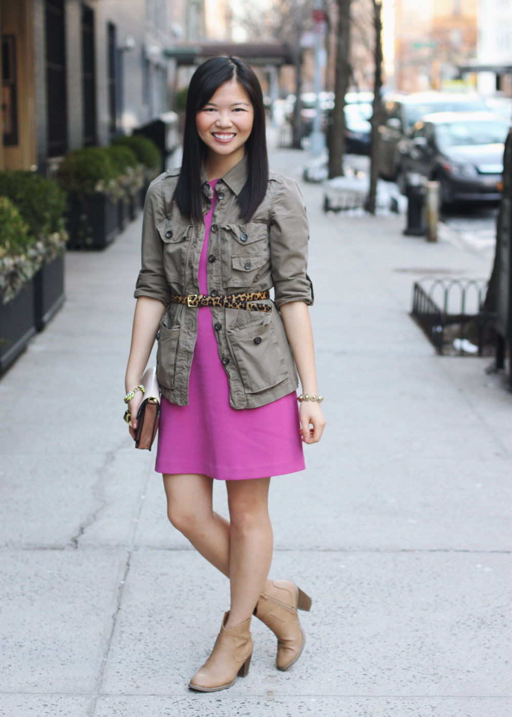 Another barelegged look coming your way! The forecast for the next week is grim, but I just can’t, for the life of me, cover up any longer. On Sunday, I threw on a utility jacket over my favorite dress sans tights for brunch and it was glorious. I have a feeling that when spring finally decides to stick around, I’ll be getting plenty of wear mixing my military jacket with everything spring.