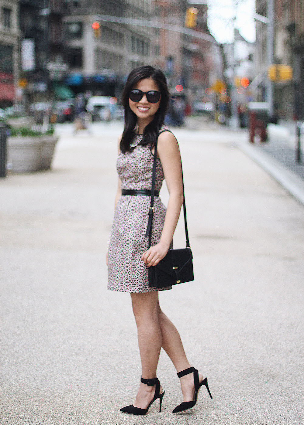I’m no stranger to leopard print: I’m talking pumps, flats, bags, multiple blouses and sweaters. I usually take leopard in small doses, so a dress is a new one for me. But I really don’t know why it took me so long add one to the wardrobe, because when you find the right print and the right cut and the cutest leather trimming, the idea of a little leopard dress doesn’t seem wild at all.