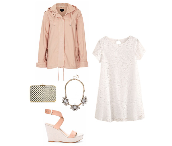 First up: a flirty feminine look.  I’m loving the blush anorak jacket from LOFT, but Topshop makes a great alternative.  Pair it with a white lace dress and a pair of strappy wedges and you’re basically the epitome of spring.