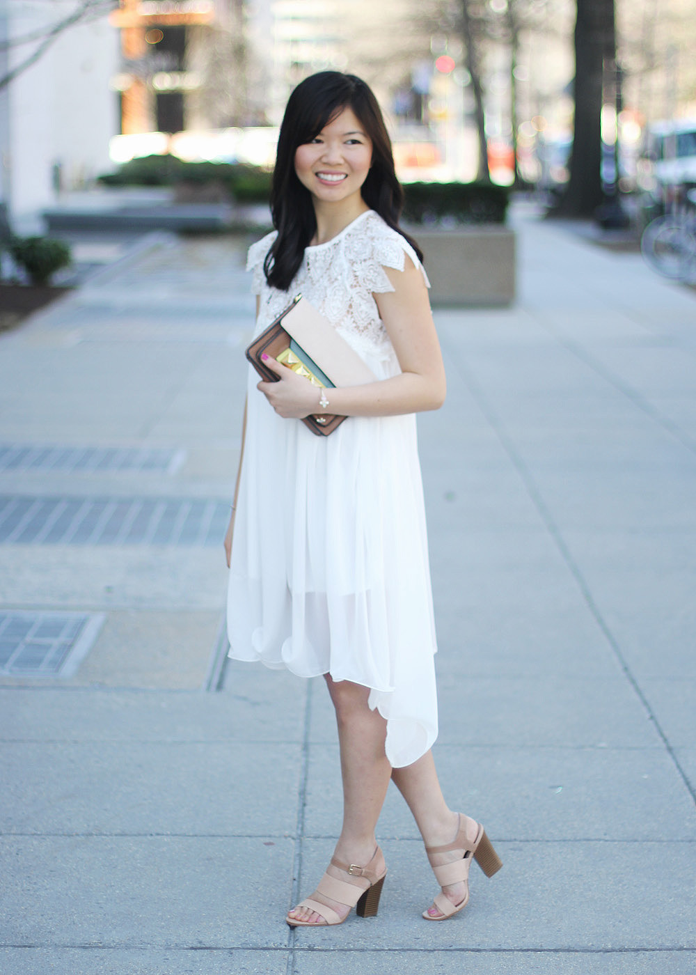 Loose-fitting clothing isn’t usually my jam, but I couldn’t help but fall in love with this gorgeous white swing dress.  One look at the detailed lace top and I know I had to make this dress work.