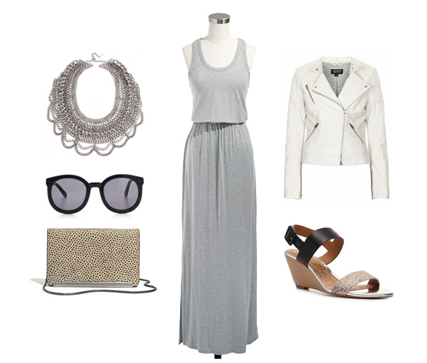 Great outfit ideas, the last one is really cool! Love the grey maxi dress with the white leather jacket!