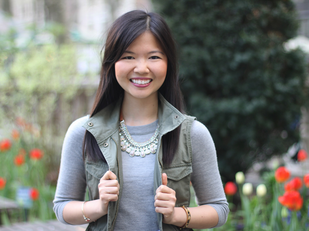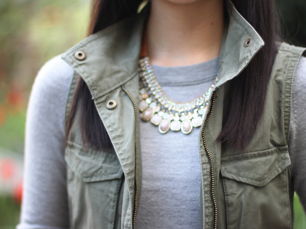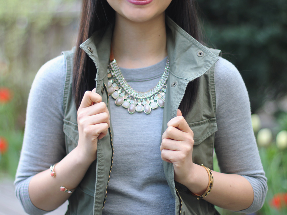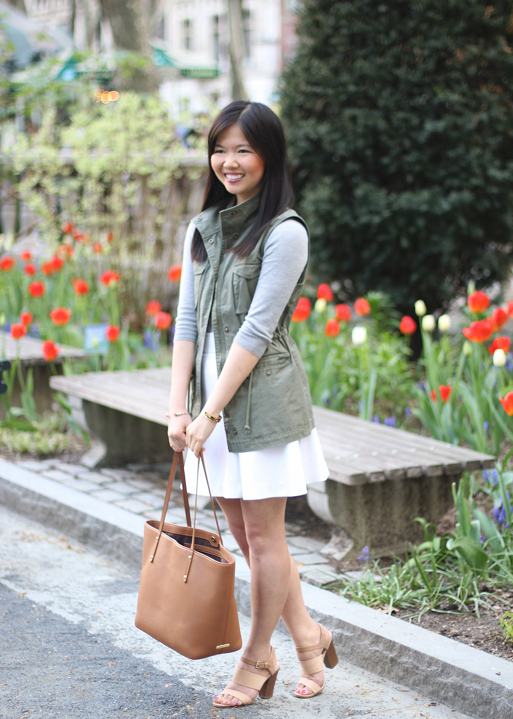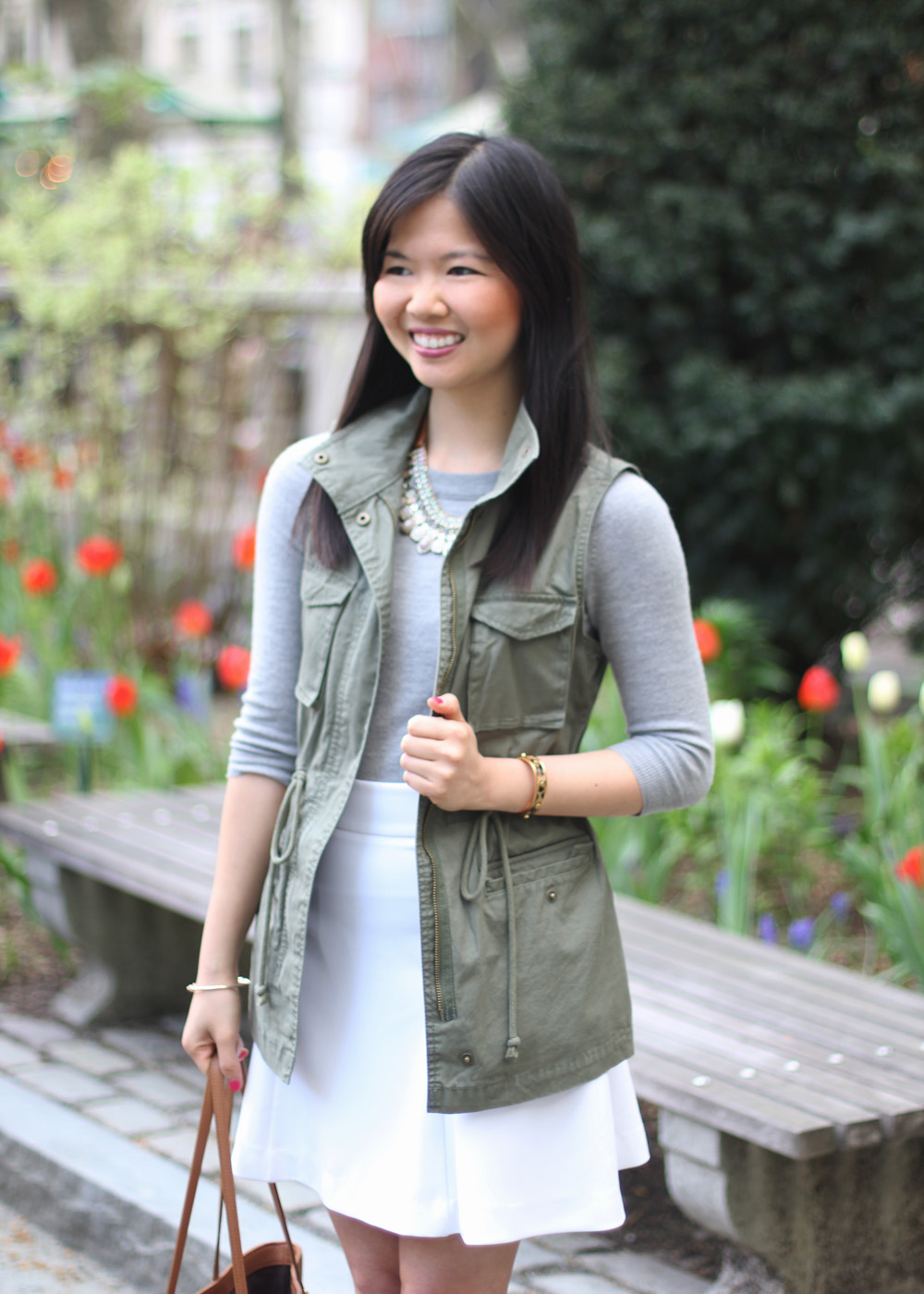 It’s my second spring in NYC and wearing lighter layers is still a relatively new concept to me. If I were still in Arizona, I’d probably be in shorts and a tank top and blasting the AC right now. But here, I need to be ready for all sorts of temps — a chilly morning, a sunny afternoon and a usually freezing office. So when I first saw this military vest, I knew I would probably be living in all season long. It’s the perfect layering piece for a laid back look. So don’t be surprised if you see start to see it over and over again on the blog.