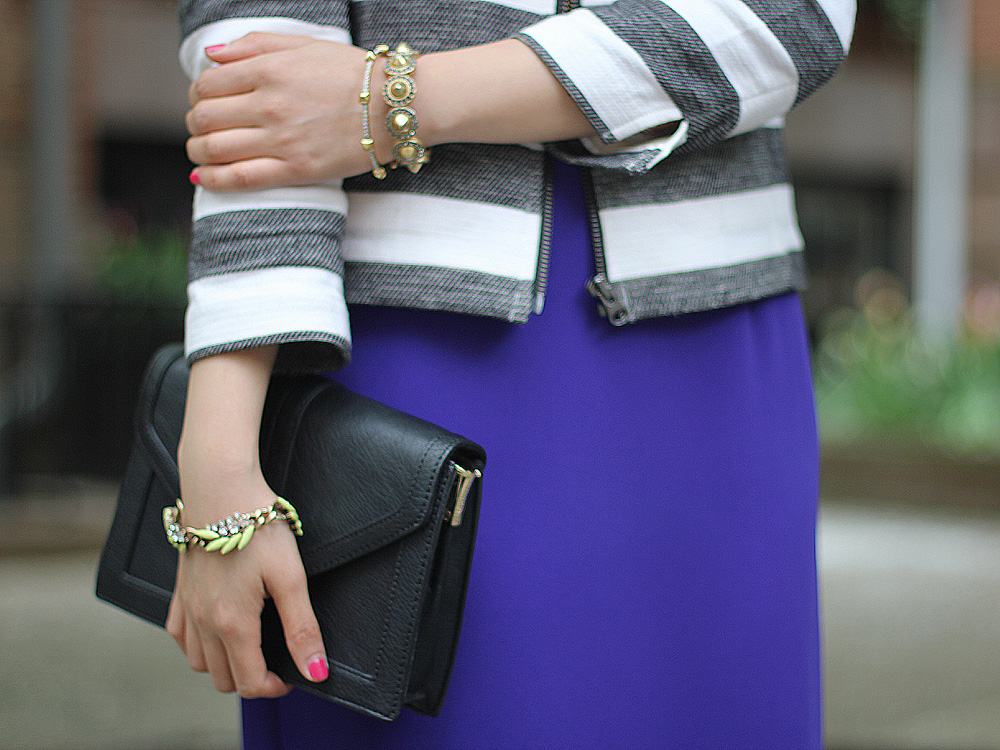 I wore this little outfit to work a few weeks ago, so let’s be real … I’m probably not looking this put together today. But a striped jacket and a brightly colored dress makes for one of my favorite work ensembles. Paired with my favorite ankle-strap heels, it’s a chic standby for when you’re having a major case of the Mondays … or Tuesdays … or any other weekday for that matter.