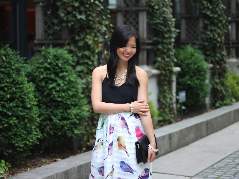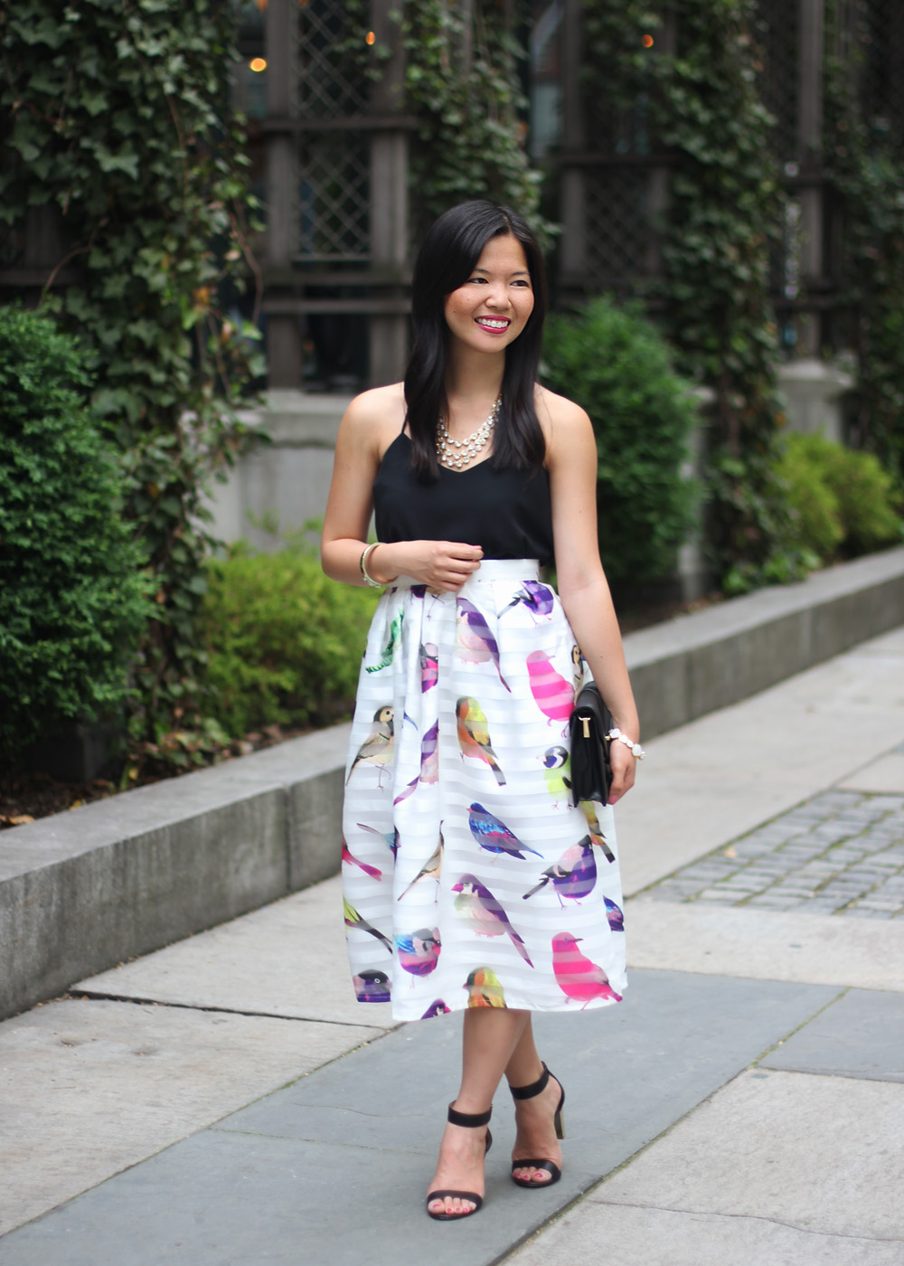 As I’m sure you know, it’s not easy getting back on the grind after an extended weekend, but today’s outfit makes it slightly more bearable. I’m obsessed with this colorful bird print midi skirt from Chicwish. It’s a bit whimsy, slightly over the top and totally playful — what’s not to love? It’s the perfect piece to combat those post-vacay blues. Happy Tuesday my loves!