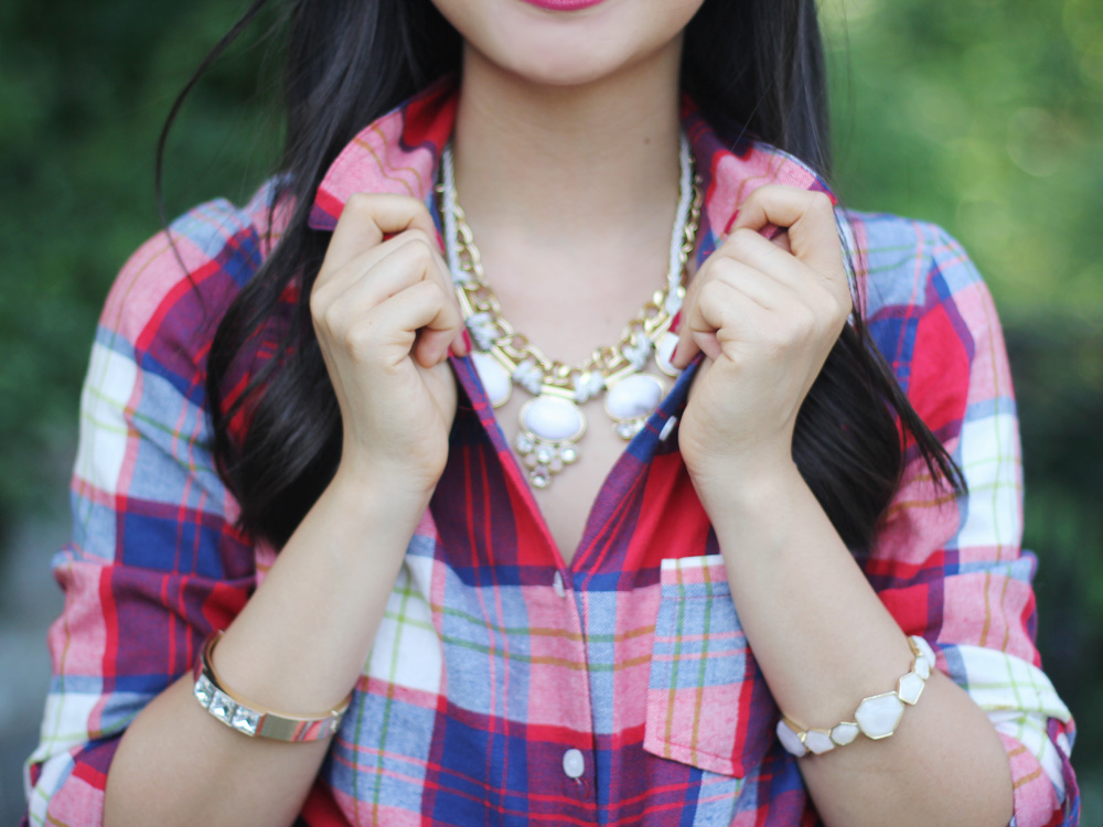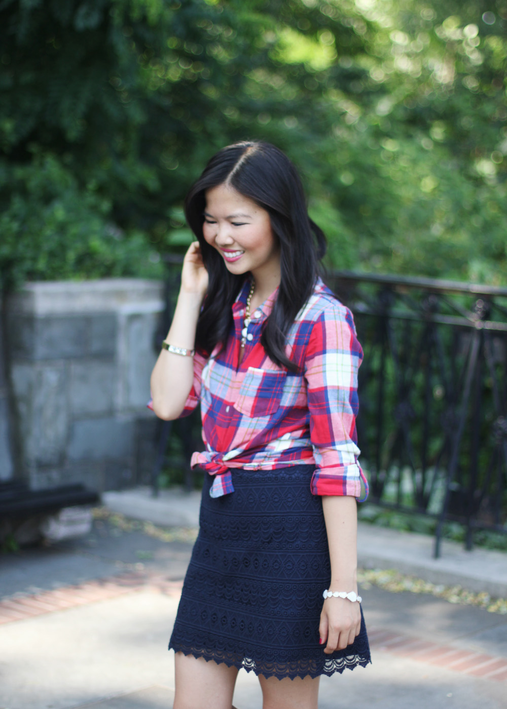 But fear not — we’re resilient travelers and are back at it this morning with a rescheduled flight with hopes of being lakeside by the late afternoon. I’ll be there for the rest of the weekend, wearing all things red, white and blue. I’m loving this navy crochet lace skirt (on sale now!) paired with a little patriotic plaid for a casual/chic holiday look. Happy Fourth of July weekend my loves!