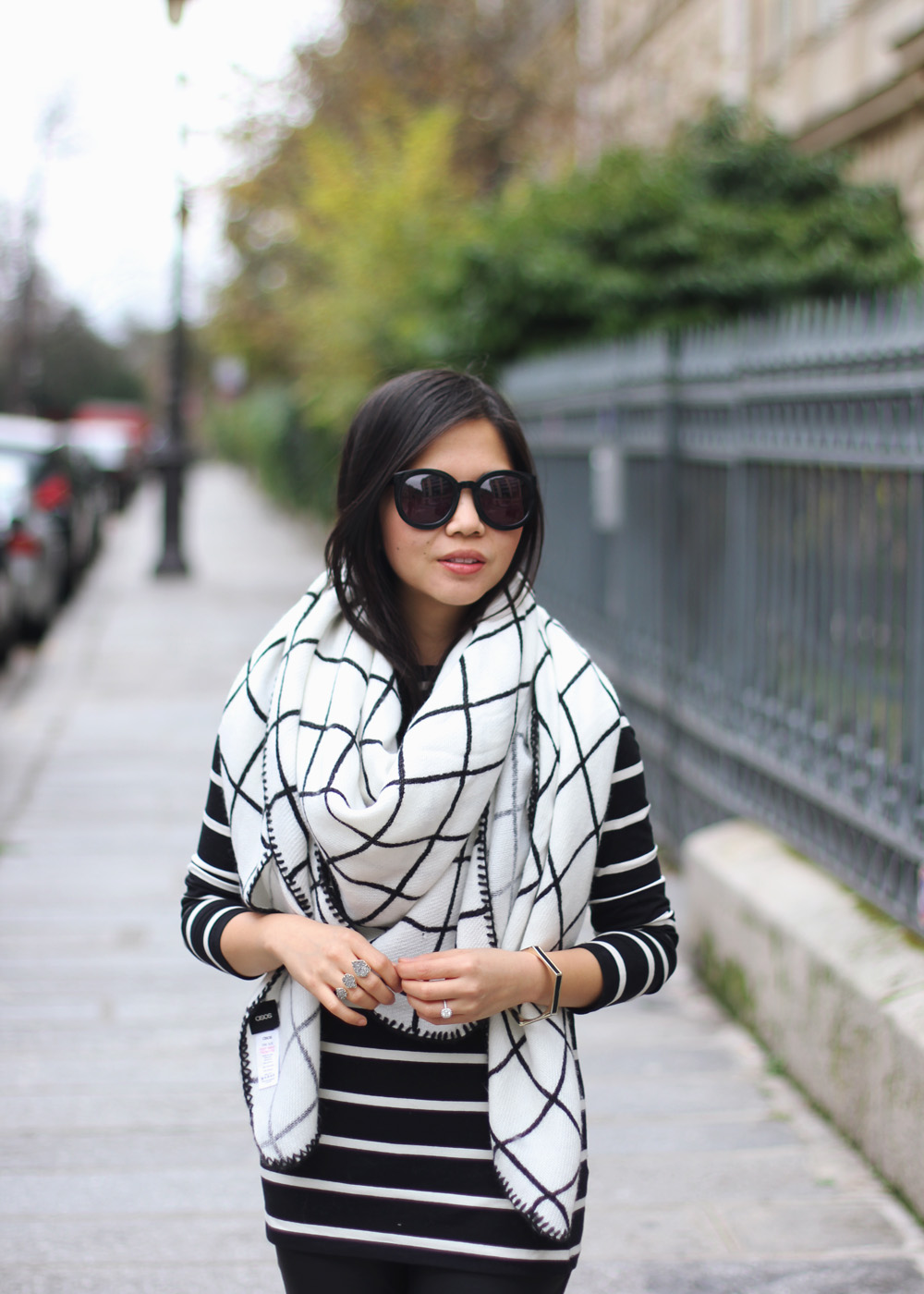 I think it’s safe to say that blanket scarf weather is here to stay.  I wore this windowpane number on our first day in Paris and got plenty of mileage out of it throughout our trip.  We walked everywhere.  Starting off at a café near the Jardin des Tuileries, we wandered down Champs-Elysées to check out the Arc de Triomphe and later scoured the city for the perfect macaron.  Priorities, ya know?