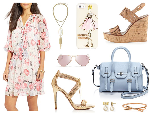 Dress // Necklace // iPhone Case // Wedge // Aviators // Bag // Heels // Earrings // Bracelet