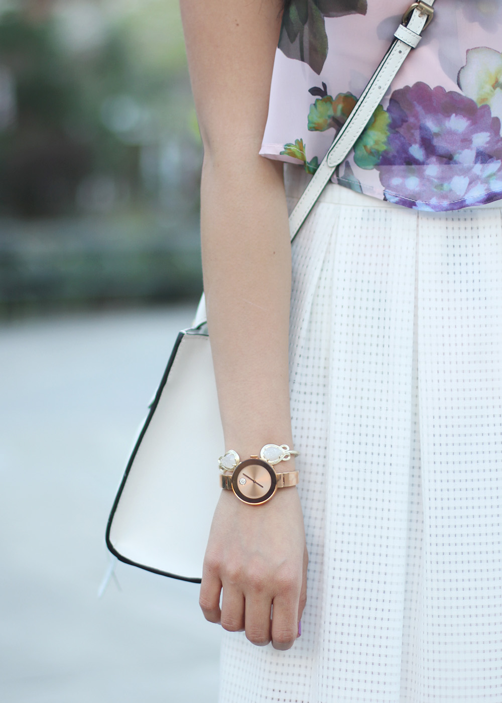 I’m both obsessed with and scared of these pieces, because let’s be real, I’m not the most graceful person — every white thing I own has some sort of mark, scratch or stain to it. So let’s enjoy this clean slate while it lasts, shall we? I wore the skirt (more affordable options here and here) over the floral romper from Monday. And assuming that I don’t make any major stains on it, I’m sure you’ll be seeing it again and again this season.