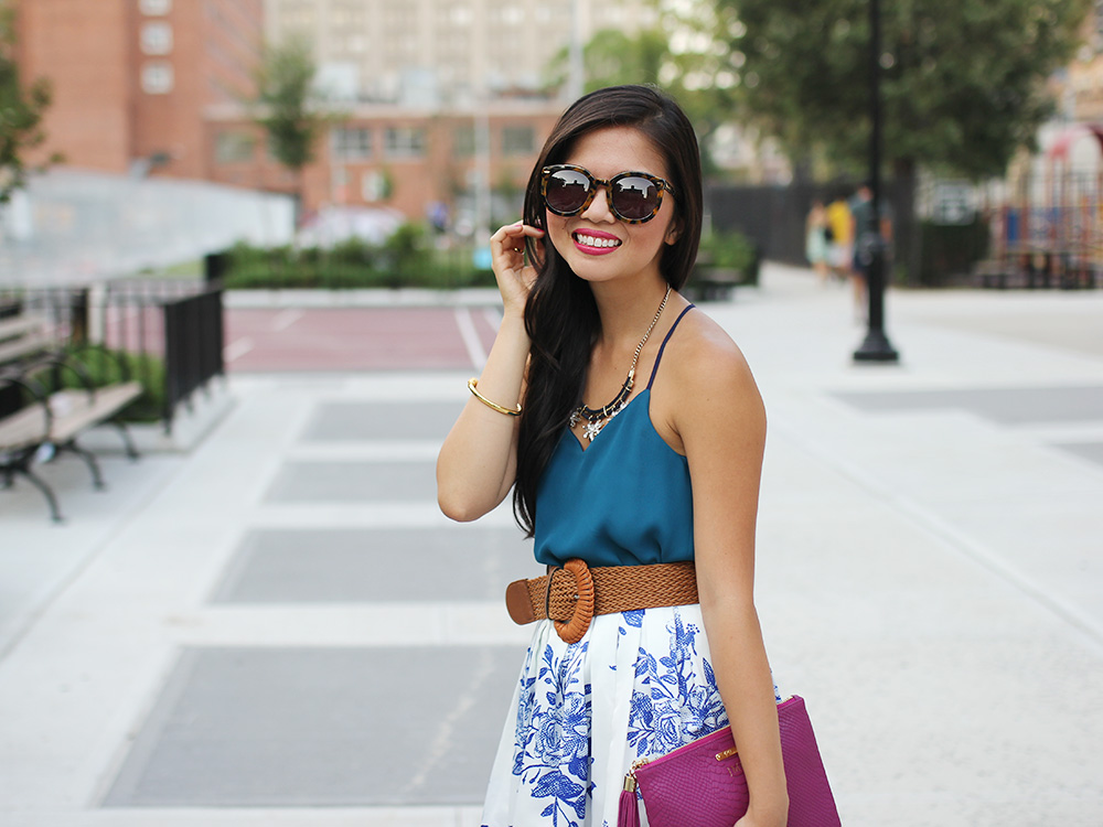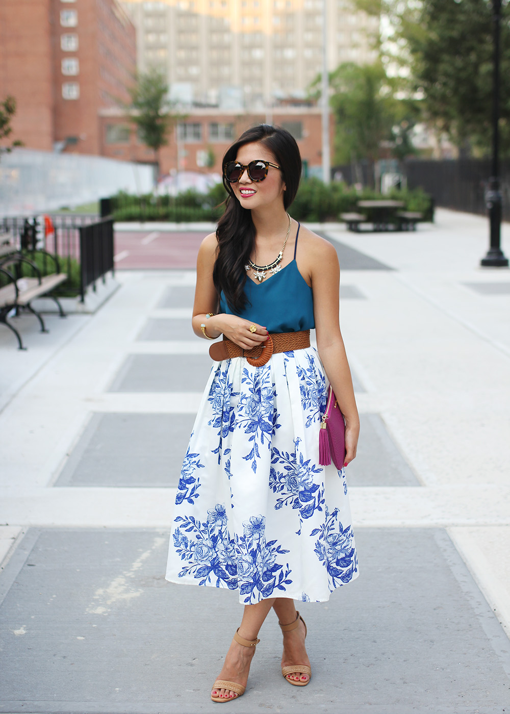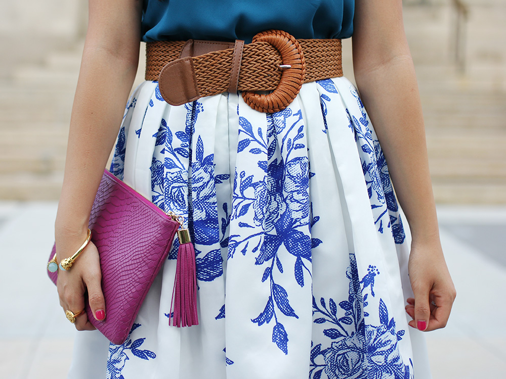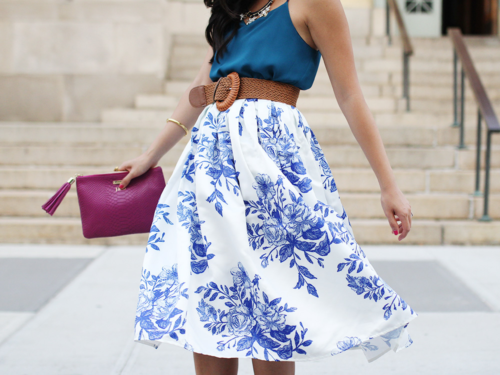 Express ‘Barcelona’ cami // Chicwish ‘Floral Sketch’ midi skirt (c/o) // Woven belt // GiGi New York ‘All in One’ clutch (c/o) // Julie Vos ‘Botticelli’ open bangle (c/o) // Julie Vos ‘Pegasus’ revolving ring (c/o) // Ankle strap heels
