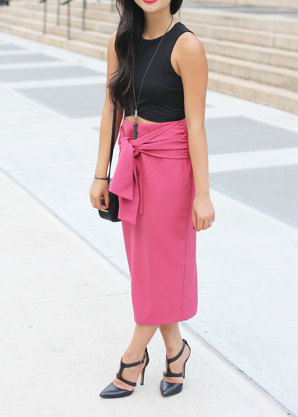Express criss cross crop top // ASOS pencil skirt with origami tie waist (also comes in teal) // GiGi New York ‘Madison’ crossbody bag (c/o) // Kendra Scott ‘Rayne’ tassel pendant necklace (c/o) // Kendra Scott ‘Liana’ bracelet (c/o) // Black strappy pumps