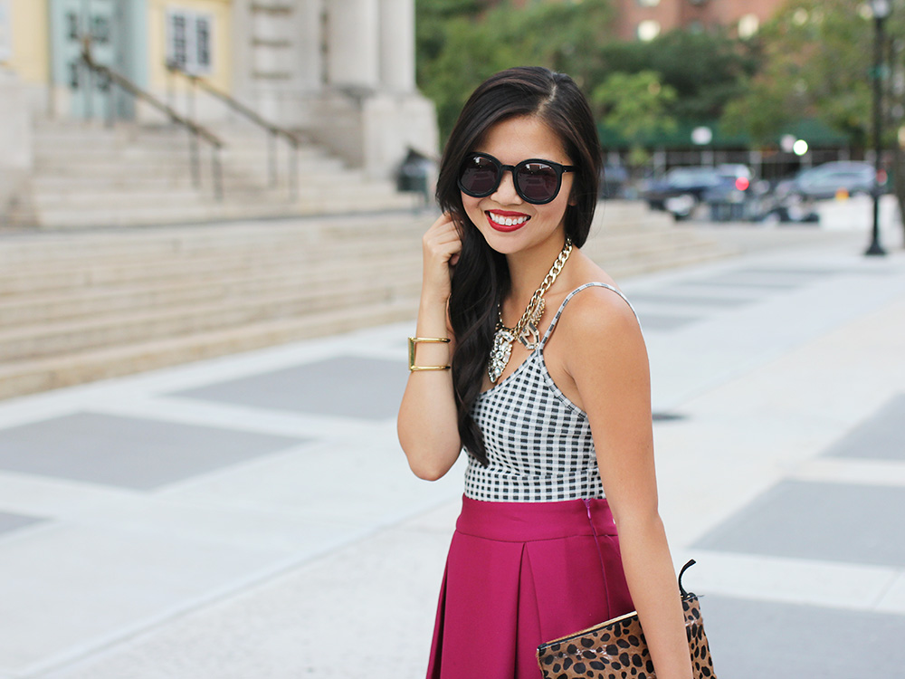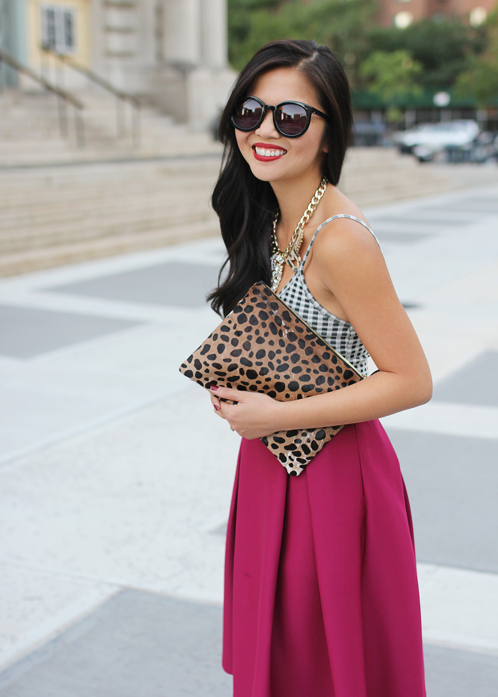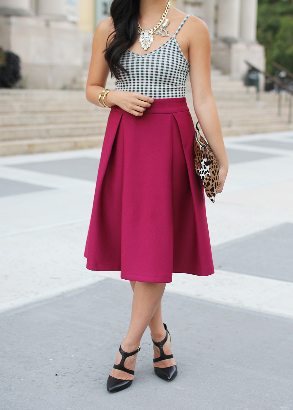 I don’t think I can count how many times I’ve worn this berry-colored midi skirt from Chicwish. It’s a year-round staple for sure, but the jewel-toned hue is especially perfect for fall. For starters, I love it paired with this simple (and super cheap) gingham cami and my favorite leopard clutch an interesting, yet easy mixed print look. And even if you’re on the short side like me (I’m 5’2″), you can still make a midi skirt work. Just add a pair of strappy pumps for a little height and a whole lot of sophistication.