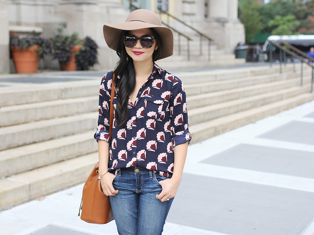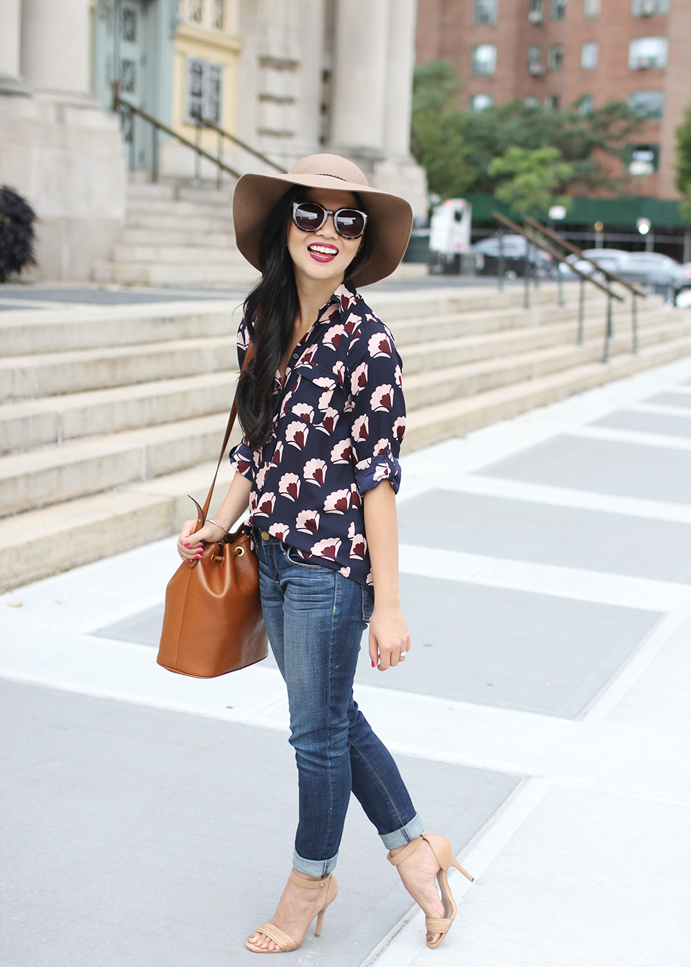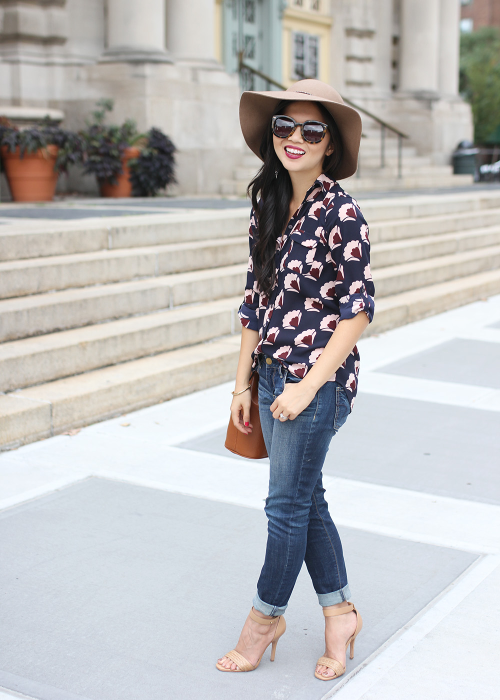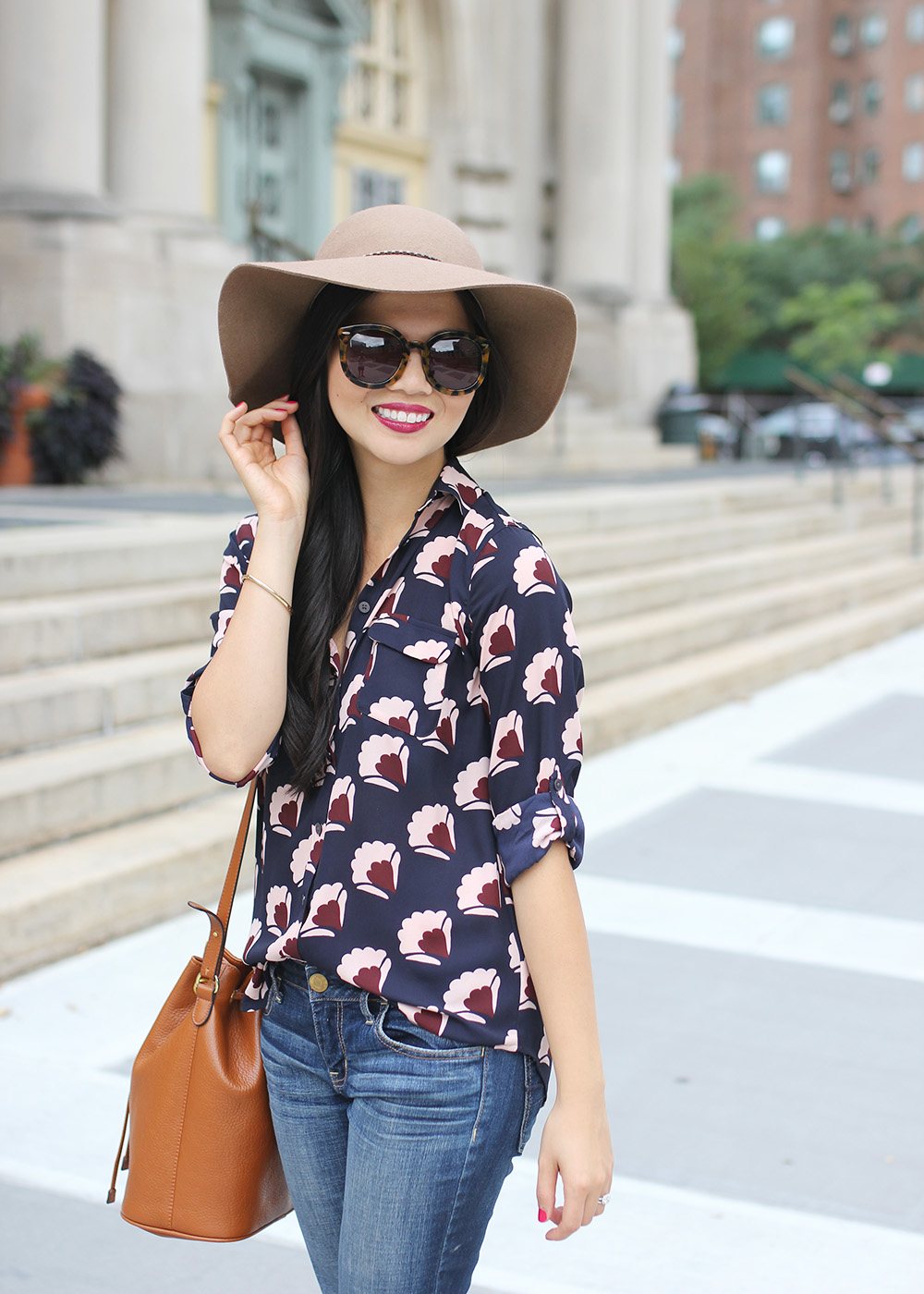 I spent the weekend switching out my wardrobe and got reacquainted with some of my fall favorites (think plaid shirts, faux fur vests and a whole lot of booties). There are also some new contenders on the block, like this floral print blouse from LOFT. I mean, how amazing is this print? I love it with a pair of skinny jeans and a felt floppy hat – it feels so perfectly fall.