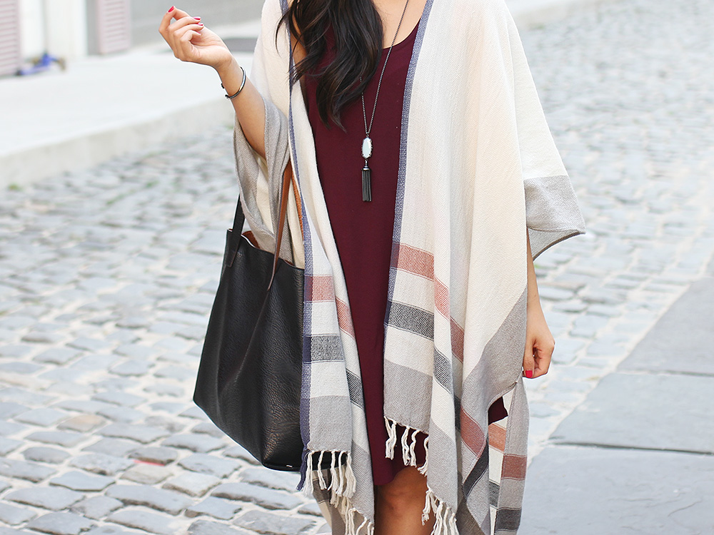 LOFT ‘Siena’ stripe poncho (on sale!) / Leith tank dress (comes in black and pink) / Karen Walker ‘Super Duper’ sunglasses / Kendra Scott ‘Rayne’ tassel pendant necklace (c/o) / Kendra Scott ‘Liana’ bracelet (c/o) / Faux leather reversible tote / Circus by Sam Edelman ‘Selma’ gladiator sandals