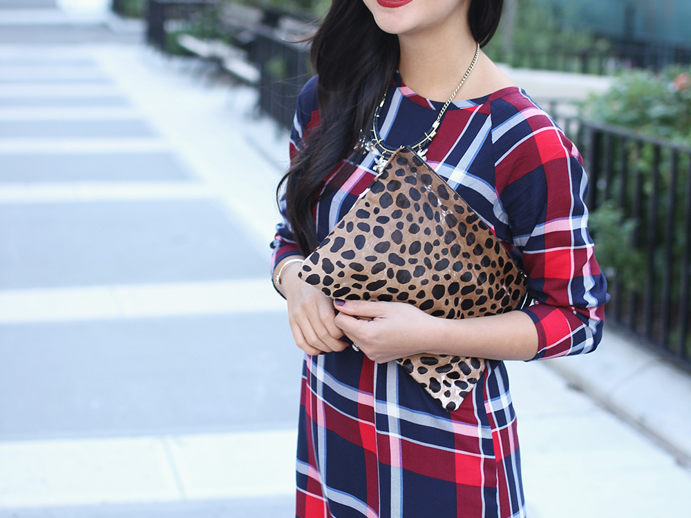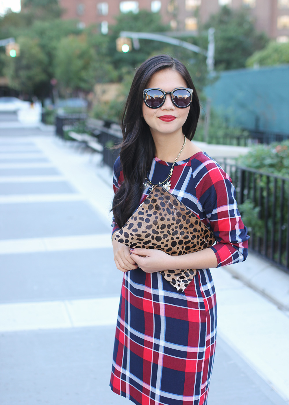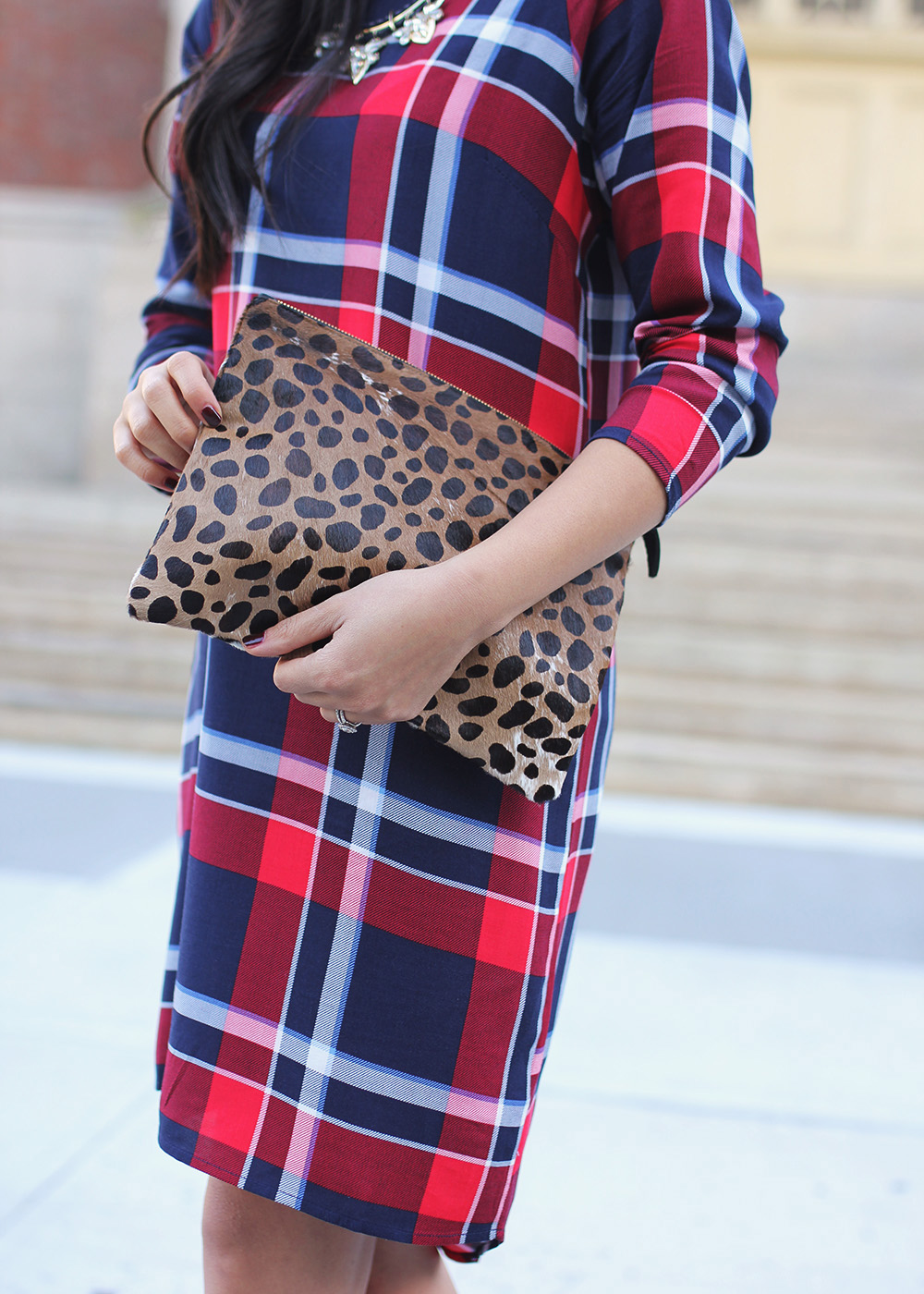 Love at first sight, of course. When I first saw this dress online, I knew I had to have it. For starters, an outfit that boasts my college colors is an instant winner in my book. But even Wildcat pride aside, a plaid dress is so perfect for fall. Wear it with heels now, booties later (see my must-have list here) and a faux fur vest when it gets even chillier out (like so). Throw in a leopard clutch (on sale through tonight!) and you can basically call it a day.