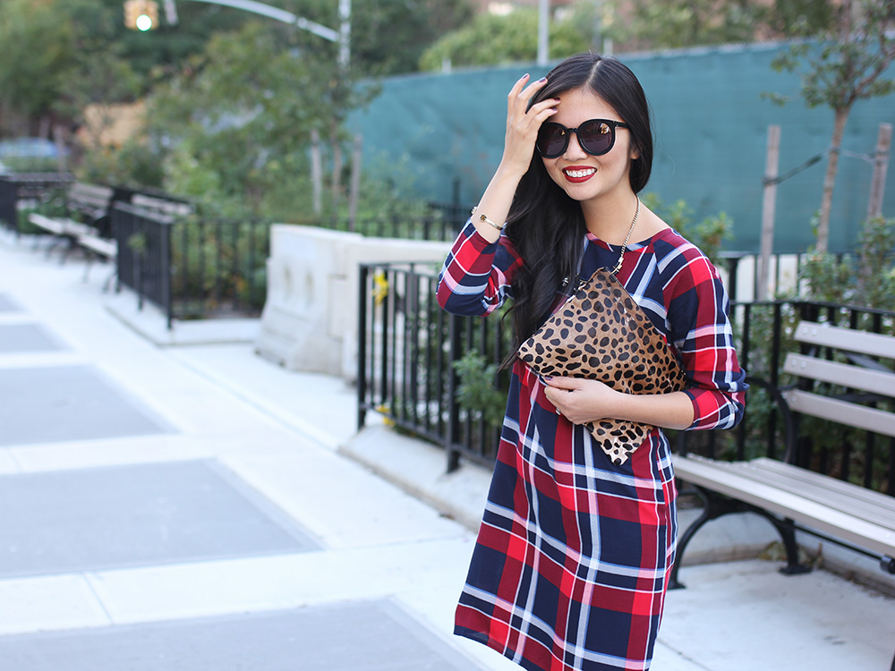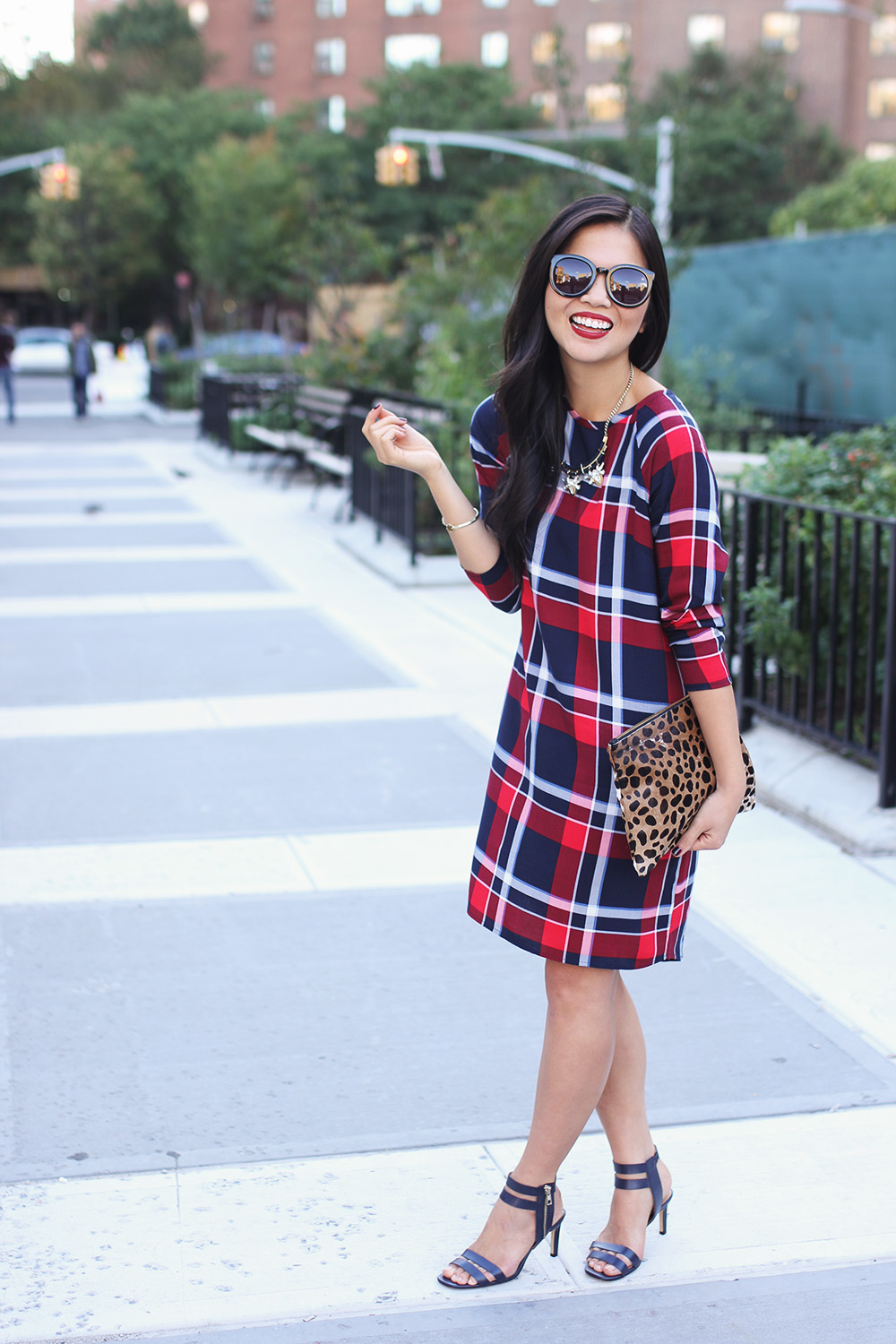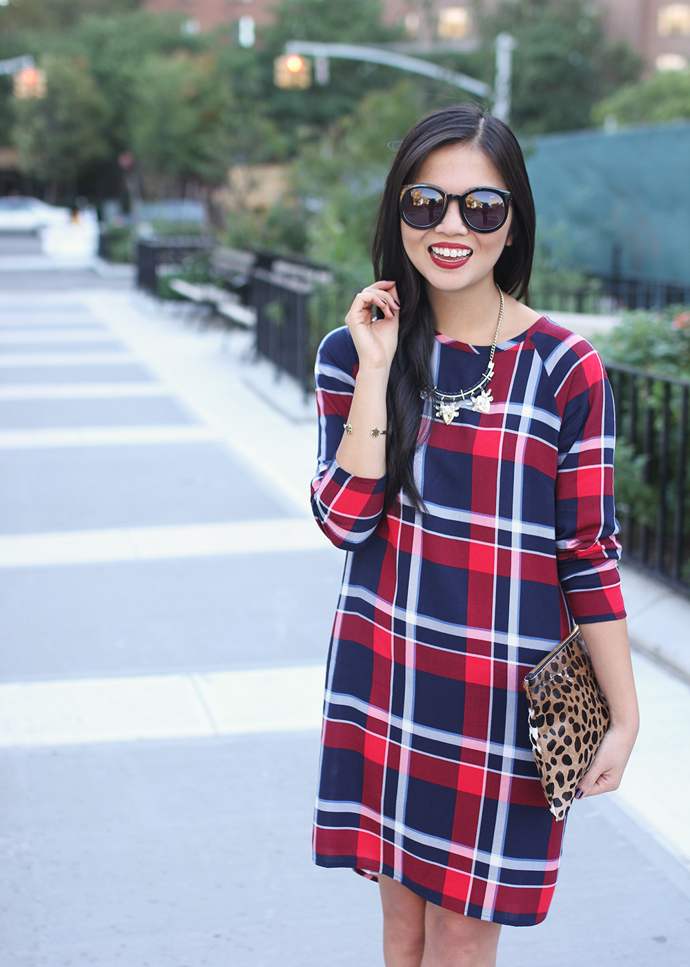 Love at first sight, of course. When I first saw this dress online, I knew I had to have it. For starters, an outfit that boasts my college colors is an instant winner in my book. But even Wildcat pride aside, a plaid dress is so perfect for fall. Wear it with heels now, booties later (see my must-have list here) and a faux fur vest when it gets even chillier out (like so). Throw in a leopard clutch (on sale through tonight!) and you can basically call it a day.