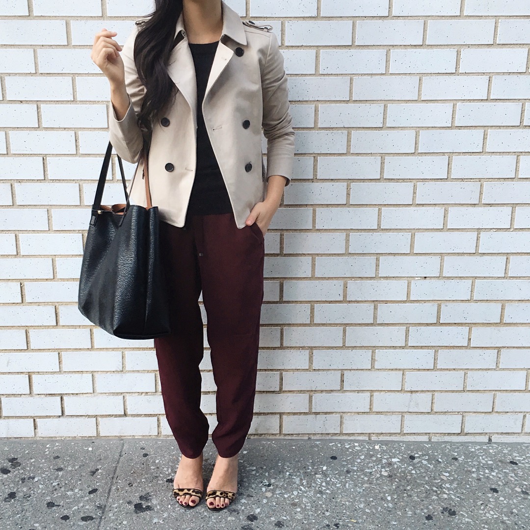 Cropped Trench Coat (similar) / Sweater / Fluid Pants / Reversible Tote Bag / Leopard Heel