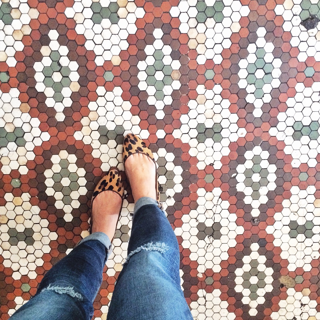 I’m not usually a jeans girl, but I recently bought this destroyed denim leggings and they are by far the most comfortable pair I’ve ever owned. I just picked up another pair in white which I’m excited to wear well into winter. Side note: this cool mosaic tile floor is from Ost Café in the East Village – they make an awesome flat white!