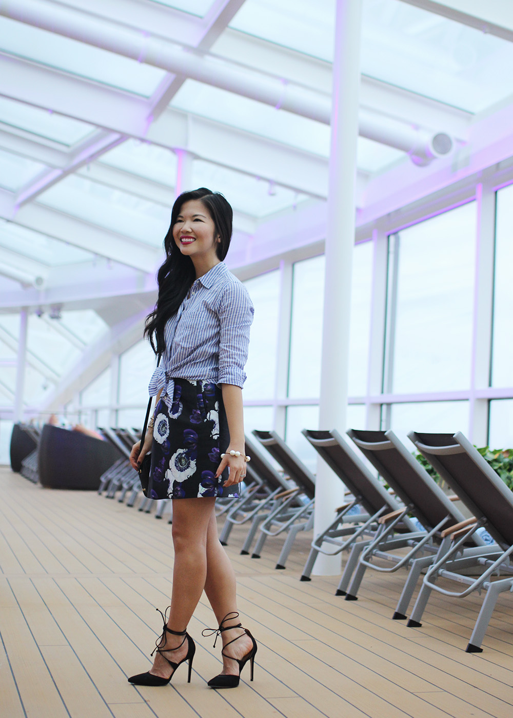 You already saw what I wore when we boarded the ship, on our first night out and during our pool time. And now I just realized that everything I wore during our voyage on Royal Caribbean’s Anthem of the Seas either had stripes or floral point to it. Case in point: this preppy shirt and skirt mix from J.Crew.