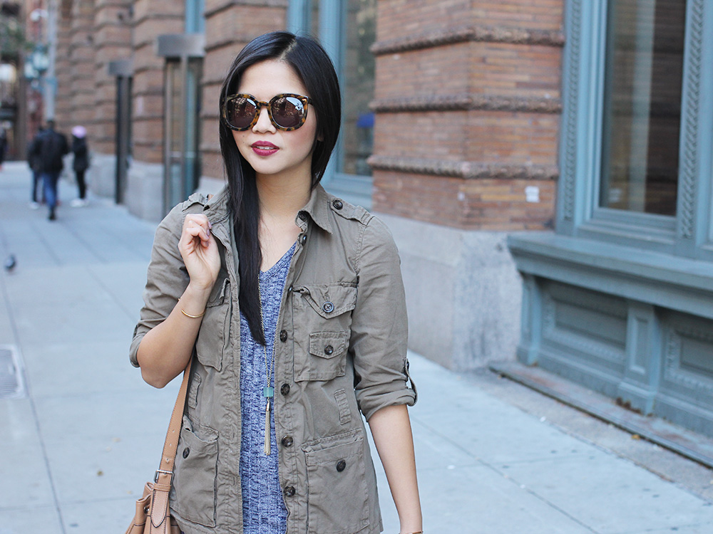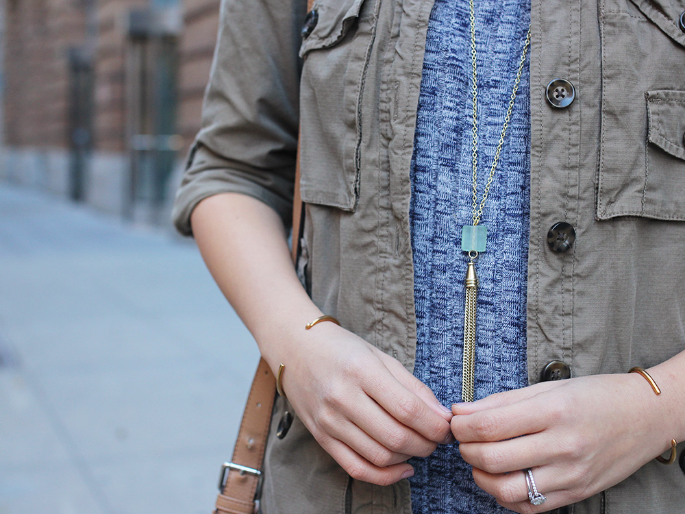 Outfit: Everly ribbed dolman sweater dress (only $44!) / Army jacket / Bucket bag / Sam Edelman ‘Petty’ suede booties (comes in 4 different colors) / Kathleen Plate cube tassel necklace (via uncommongoods) / Christa Pisto crochet hook bracelets (via uncommongoods) / Makeup: Too Faced Too Faced Born this Way foundation in ‘Ivory’ / Too Faced Endless Summer bronzer / NARS blush in ‘Dolce Vita’ / NARS velvet lip pencil in ‘Damned’