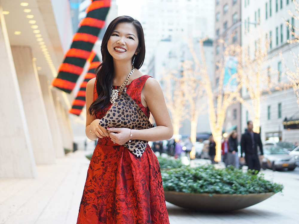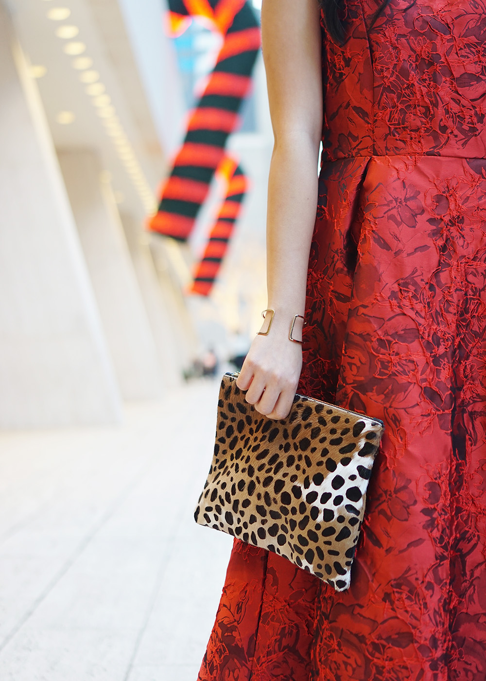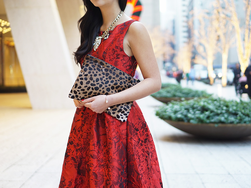 This dress is stunning! I love the subtle pattern on it, and the bright red is a beautiful colour. Great idea adding the leopard clutch.