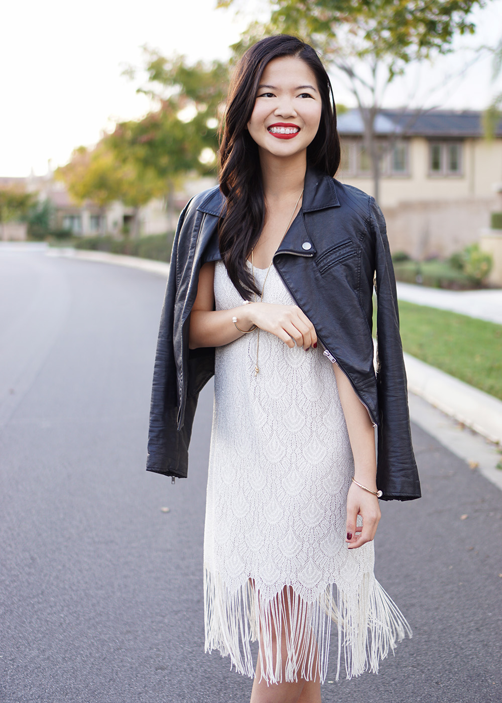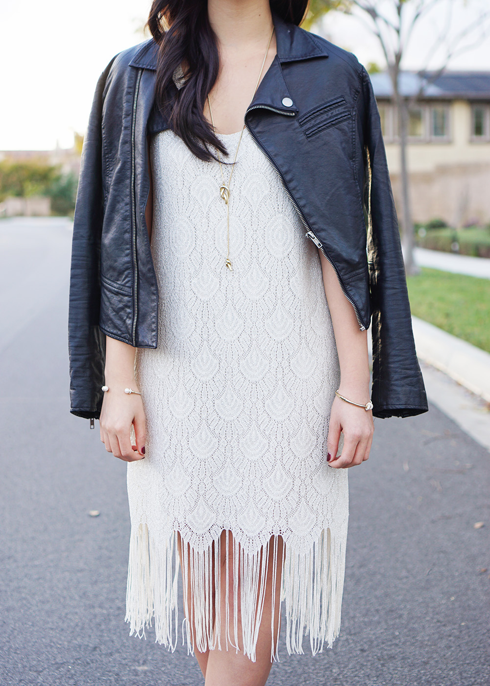 Outfit: Painted Threads fringe trim shift dress (on sale for $35!) / Faux leather moto jacket / Madewell knotshine necklace / Ann Taylor pearl skinny cuff / Kate Spade sailor knot bangle / BP ‘Trolley’ ankle bootie / Makeup: Too Faced Born this Way foundation in ‘Ivory’/ Too Faced Endless Summer bronzer / Anastasia ‘Brow Wiz’ eyebrow pencil in ‘Dark Brown’ / Make Up For Ever mascara / NARS blush in ‘Dolce Vita’ / NARS velvet matte lip pencil in ‘Mysterious Red’
