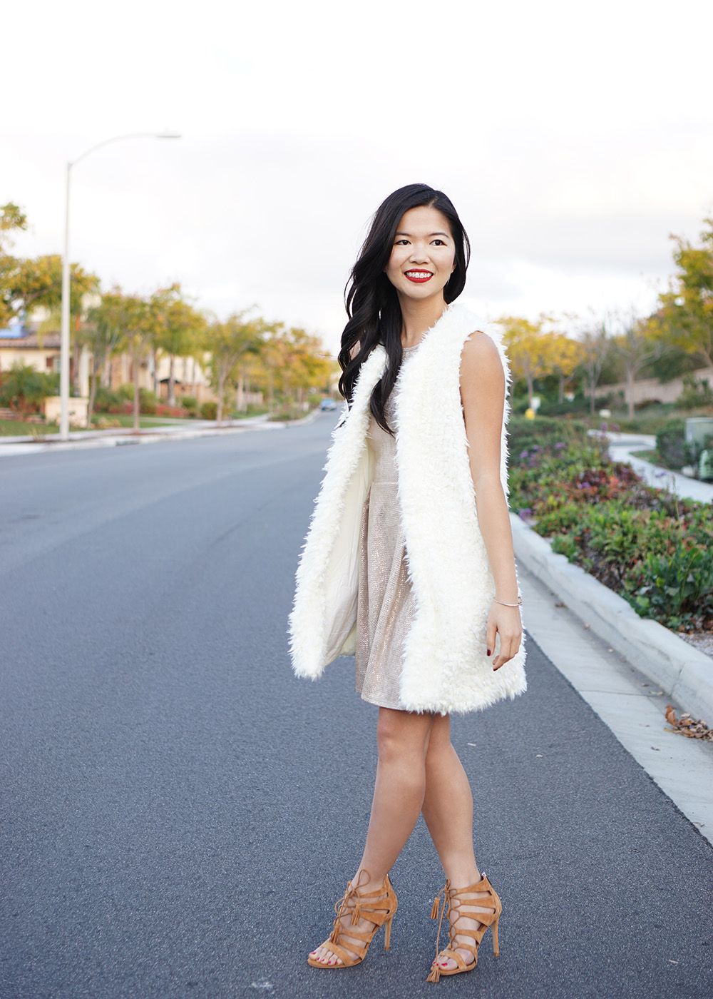 I shared my first look yesterday (my fringe dress is already almost sold out!) and today’s look is equally as party-ready. New Year’s Eve and metallic-anything go hand in hand, am I right? So if gold glam is your more you thing, this is the perfect dress for you. I love the high neckline and the fit and flare silhouette. I layered on this incredibly soft faux fur vest for warmth, but love the combination of textures. Now I just need to decide which outfit to go with for NYE!