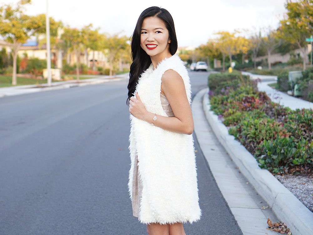 Outfit: Soprano foil high neck fit & flare dress (only $48!) / LAmade ‘Mac’ faux fur vest (almost sold out!) / Gold X cuff / Kendra Scott ‘Andy’ station cuffMakeup: Too Faced Born this Way foundation in ‘Ivory’/ Too Faced Endless Summer bronzer / Anastasia ‘Brow Wiz’ eyebrow pencil in ‘Dark Brown’ / Make Up For Ever mascaraNARS blush in ‘Dolce Vita’ / NARS velvet matte lip pencil in ‘Mysterious Red’