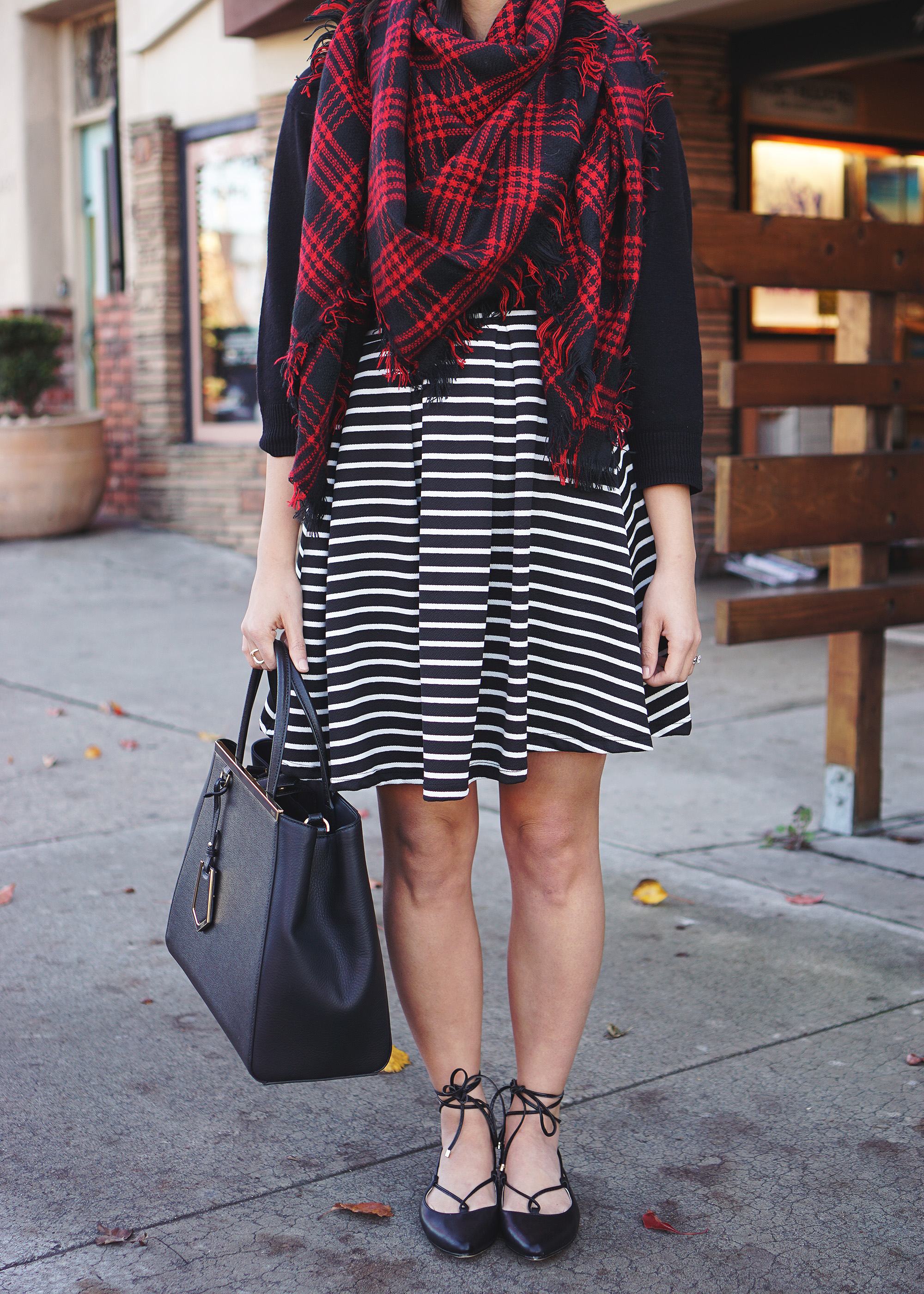 Mixed prints and major markdowns … and today’s outfit involves both! I wore this look while exploring a cute neighborhood in San Diego a few weeks ago. Now, my red and plaid scarf is 50% off – I keep seeing it going out of stock and then re-appearing online, but I imagine it won’t be around much longer at $13. My black sweater, which has super cozy dolman sleeves, is only $35 and my striped mini-skirt is only $20. I’m basically a walking sale section today and I’m not mad about it. Because nothing says “I survived another Monday” like a little retail therapy.
