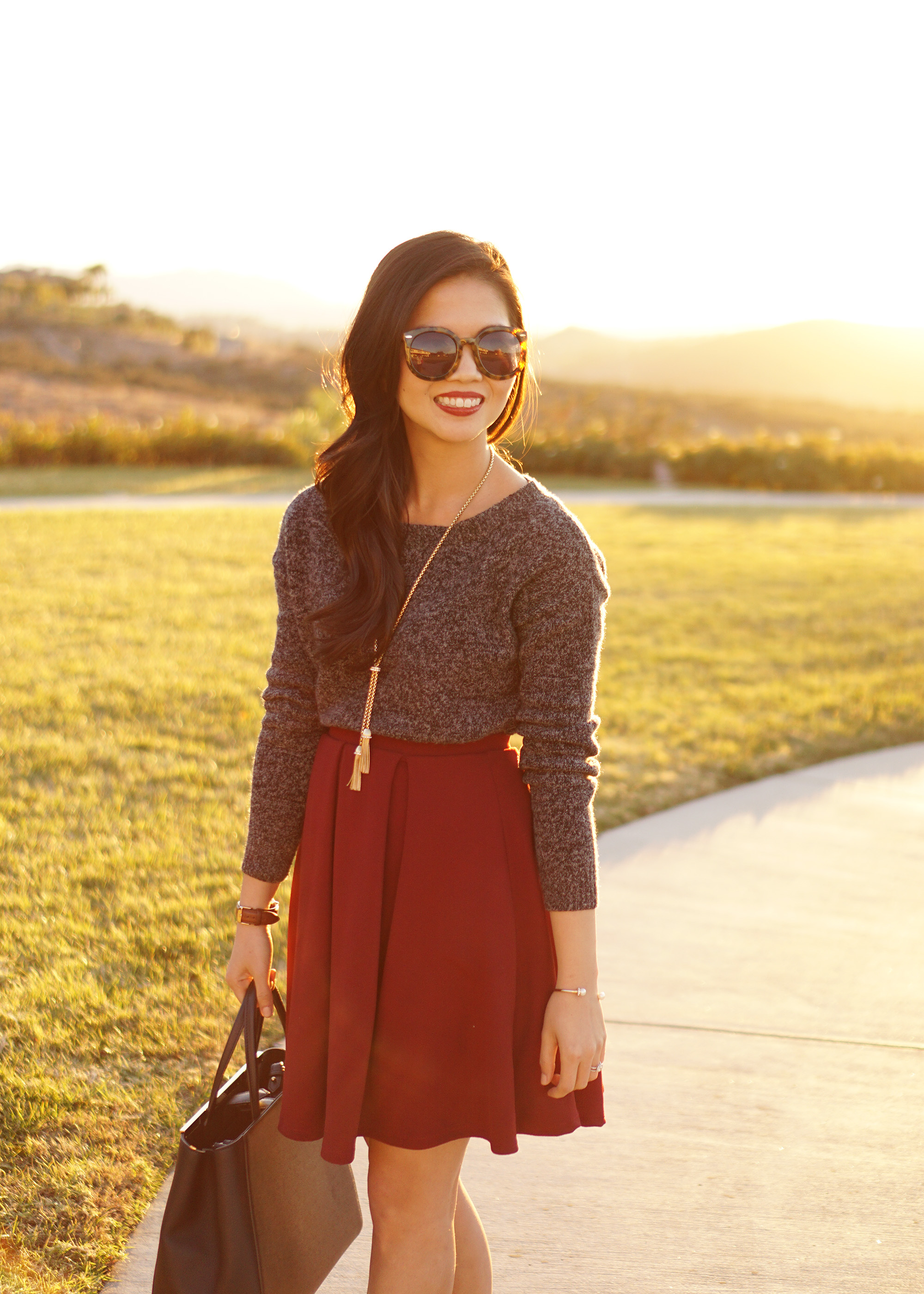 Outfit: Caslon back zip high/low sweater / Painted Threads pleated a-line skirt (on sale for $20!) / Gold tassel necklace / Daniel Wellington ‘Classic St. Mawes’ 40mm watch / Ann Taylor skinny pearl cuff / Fendi ‘2Jours Elite’ leather tote / BP ‘Trolley’ ankle bootie / Makeup: Too Faced Born this Way foundation in ‘Ivory’ / Too Faced Endless Summer bronzer / Anastasia ‘Brow Wiz’ eyebrow pencil in ‘Dark Brown’ /Make Up For Ever mascara / NARS blush in ‘Dolce Vita’ / NARS velvet matte lip pencil in ‘Cruella’