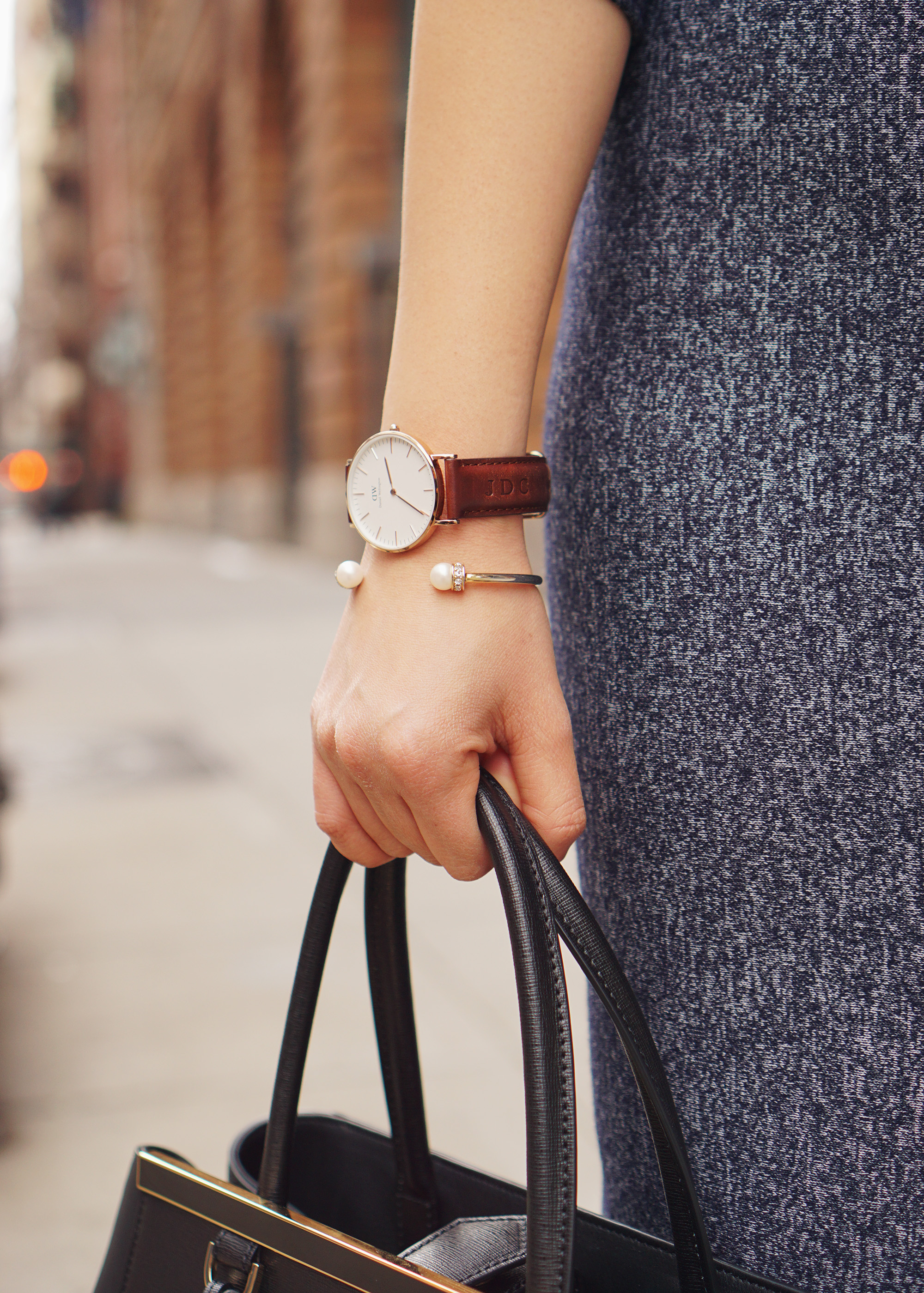 I think I’m addicted to turtlenecks. It first started with this sweater (coming to the blog soon); now meet the latest addition to the arsenal. This navy speckled dress is made from a stretchy knit material, which is much lighter and softer than the usual cable-knit texture you find during this time of year. It’s kind of perfect considering the unseasonably warm winter we’re having. True story, it’s mid-January and I wore this bare-legged look to brunch with Katie on Saturday – right before we finally got our first snowflakes of the season on Sunday.
